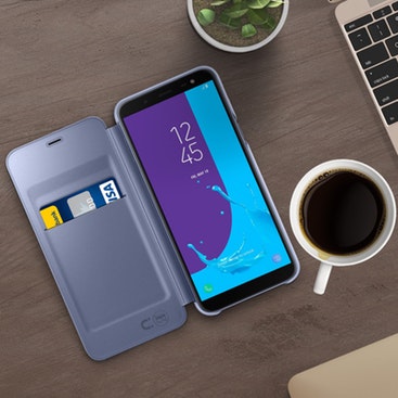 Funda original Samsung Wallet Cover para Samsung Galaxy J6. Una funda elegante que protege tu móvil contra golpes y arañazos. Con ranura para guardar tarjetas o dinero siempre a mano. Carcasa de sujeción interna reforzada.