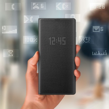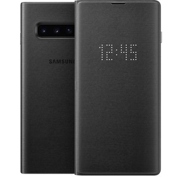 Funda LED original Samsung para Galaxy S10 Plus. Con un revestimiento que imita el cuero, esta funda moderna protege a la vez que muestra la hora y permite personalizar los iconos. Incluye ranura para tarjetas o algo de dinero.