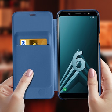 Funda original Samsung Wallet Cover para Samsung Galaxy A6 Plus. Elegante y lista para proteger tu móvil contra golpes y arañazos. Con billetera para simplificarte las cosas. Carcasa interior de sujeción reforzada para que tu móvil no se mueva