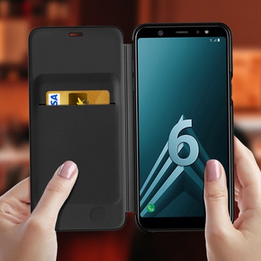 Funda original Samsung Wallet Cover para Samsung Galaxy A6 Plus. Elegante y lista para proteger tu móvil contra golpes y arañazos. Con billetera para simplificarte las cosas. Carcasa interior de sujeción reforzada para que tu móvil no se mueva