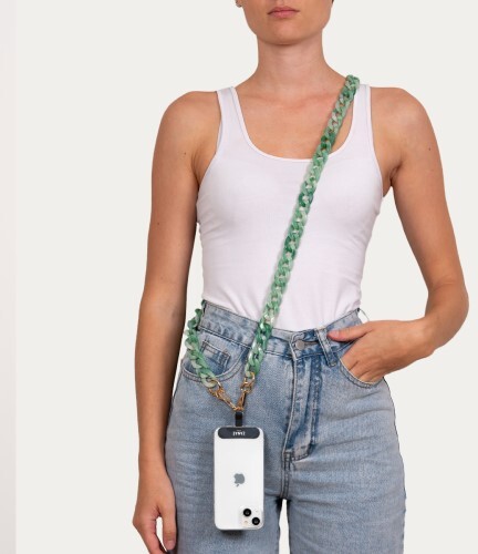 El colgante de Zanae es una práctico accesorio que le permitirá llevar su teléfono colgado de forma muy cómoda y segura. Su sistema de fijación se coloca dentro de la funda (incluido) y lo convierte en un sistema universal para todos los teléfonos del mercado que te permite llevarlo tanto de forma frontal como lateral.