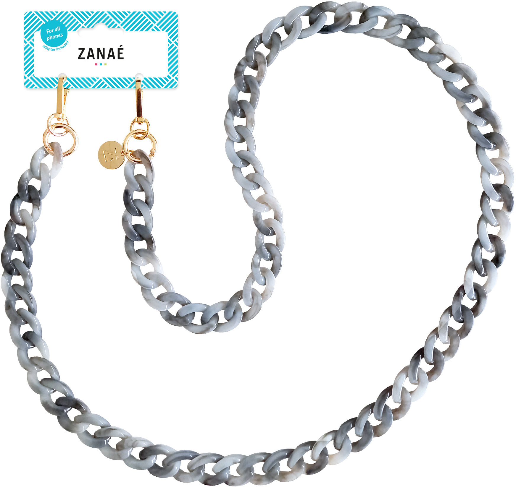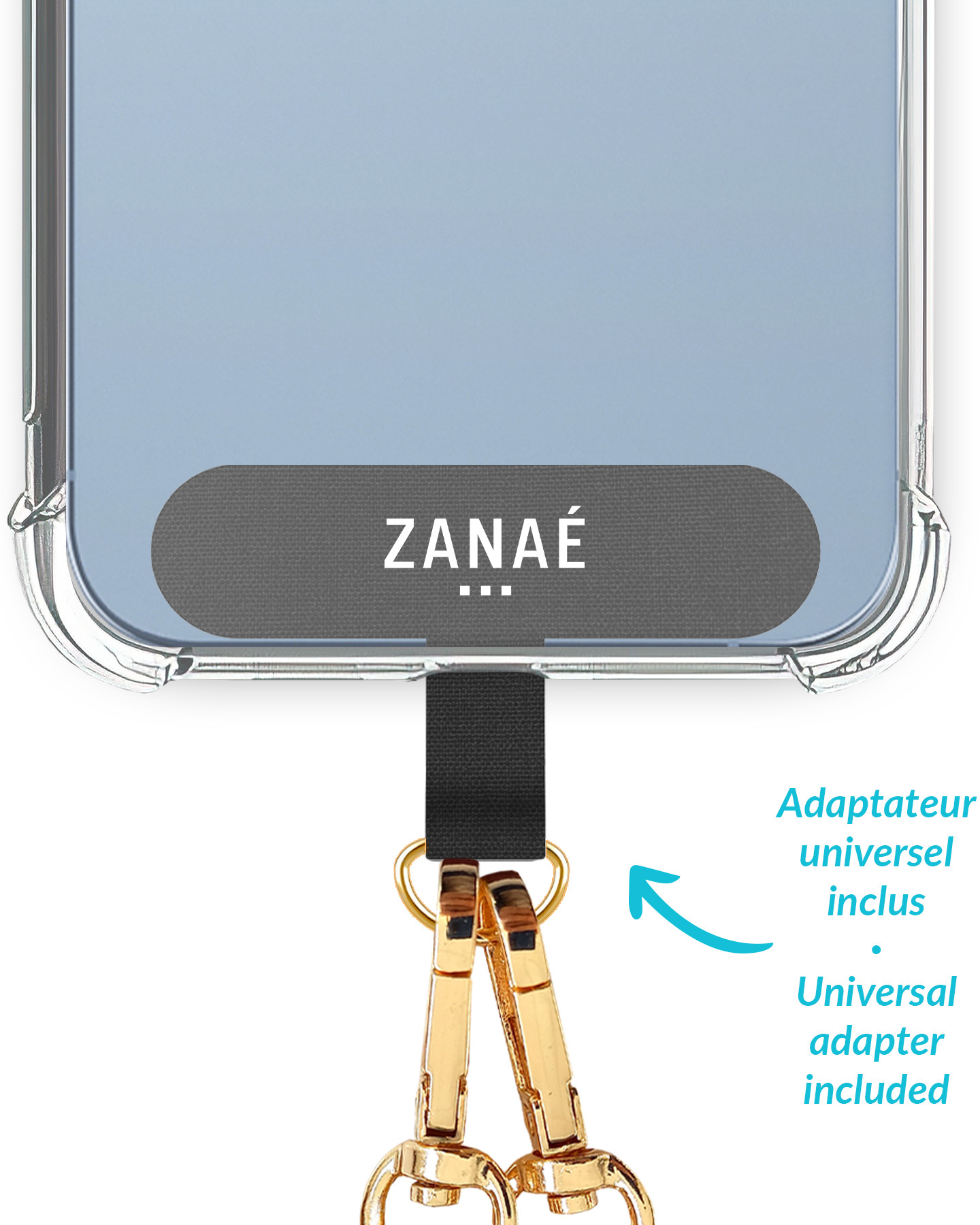 El colgante de Zanae es una práctico accesorio que le permitirá llevar su teléfono colgado de forma muy cómoda y segura. Su sistema de fijación se coloca dentro de la funda (incluido) y lo convierte en un sistema universal para todos los teléfonos del mercado que te permite llevarlo tanto de forma frontal como lateral.