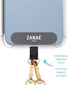 El colgante de Zanae es una práctico accesorio que le permitirá llevar su teléfono colgado de forma muy cómoda y segura. Su sistema de fijación se coloca dentro de la funda (incluido) y lo convierte en un sistema universal para todos los teléfonos del mercado que te permite llevarlo tanto de forma frontal como lateral.