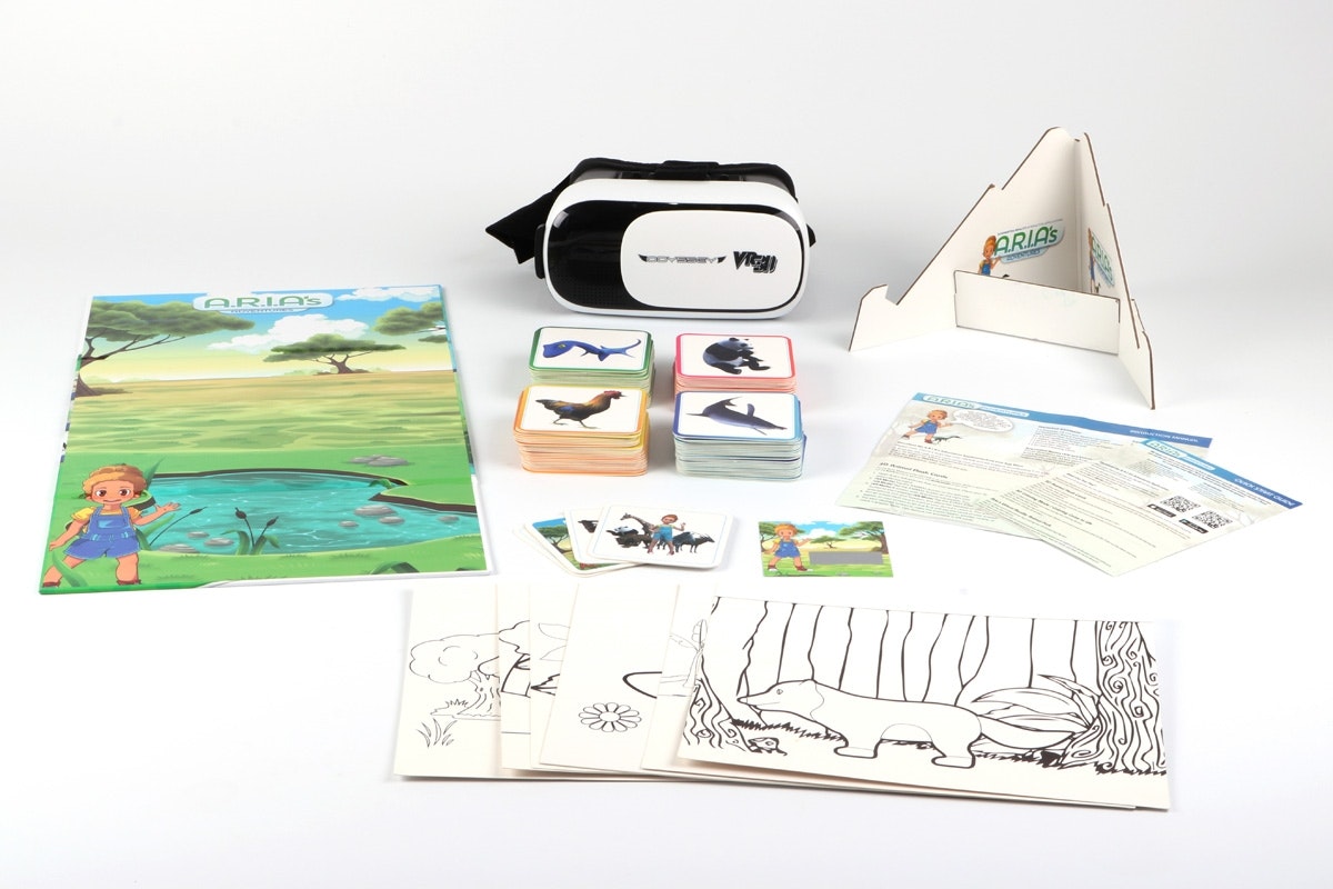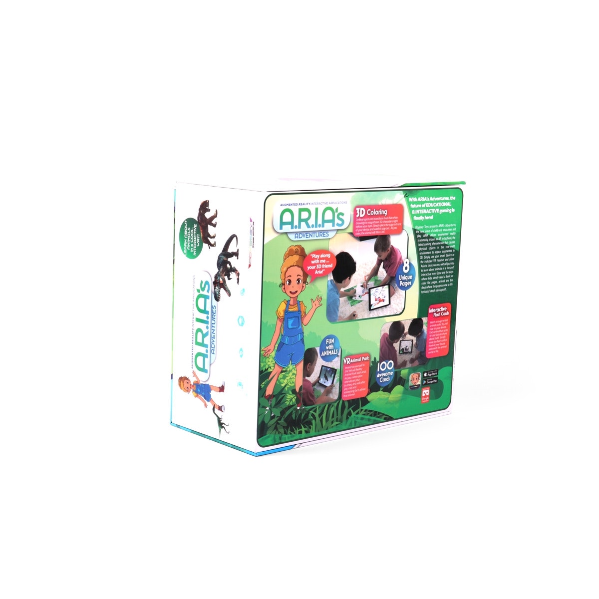 Descripción General El conjunto educacional interactivo Las Aventuras de Aria sumergirá a los niños a partir de seis años en un mundo diverso e informativo. Con él aprenderán interactivamente muchas cosas sobre los animales y se familiarizarán con la tecnología de una manera lúdica. Podrán ver hasta 100 animales y dinosaurios diferentes desde todos los ángulos a través de una aplicación gratuita disponible para iOS y Android. Además, podrán interactuar con ellos aprendiendo sus nombres y datos curiosos como costumbres, hábitat, el sonido que emiten etc. También podrán poner a prueba su memoria con un juego mediante el cual repasarán los conocimientos adquiridos y colorear dibujos para ver como cobran vida. Las gafas de Realidad Virtual incluidas revelarán ante sus ojos un emocionante mundo virtual.INCLUYE 100 FICHAS INTERACTIVAS:Escanea una ficha con tu Smartphone para hacer que los animales cobren vida y puedas verlos caminar, volar y rugir mientras aprendes hechos curiosos de cada animal.CONSTA DE 3 JUEGOS DIFERENTES 1. Fichas de animales en 3D: Colocando las distintas fichas frente al Smartphone, Tablet o las gafas de realidad virtual incluidas observarás cómo el animal cobra vida. Puedes elegir entre obtener información del mismo o presionar el interrogante para poner a prueba sus conocimientos. 2. Colorea en 3D:Las Aventuras de Aria incluye 12 páginas para colorear que colocando frente al Smartphone, Tablet o gafas de realidad virtual traerán los personajes al mundo real para estimular su creatividad. Además, podrás descargar un número ilimitado de hojas para colorear aquí3. Parque Animal de Realidad Virtual: Entra en el Parque Animal para embarcarte en un increíble viaje virtual. Explora el paisaje y encuentra numerosos animales con los que podrás interactuar. 2 EN UNO: REALIDAD AUMENTADA Y REALIDAD VIRTUALLos juegos y aplicaciones de Realidad Aumentada (AR) y Realidad Virtual (VR) están a la orden del día conquistando la industria del videojuego rápidamente y muy pronto, estarán en todas partes.Con Las Aventuras de Aria podrás experimentar con ambas ya que todos los juegos se pueden llevar a cabo con o sin las gafas de realidad virtual incluidas. Para una mayor claridad y facilidad de uso observarás que los juegos de realidad aumentada (AR) están situados a la izquierda de la aplicación y los juegos de realidad virtual (VR) a la derecha. APLICACIÓN GRATUITA EN ESPAÑOLPor favor, ten en cuenta que esta aplicación ocupa más de 100 MB y por lo tanto es recomendable descargarla a través de aplicación Wi-FiBusca Aria’s Adventures en Apple Store o Google Play. Instálala y ábrela. Después pulsa el icono de ajustes en la pantalla de inicio. Selecciona el idioma español marcando la casilla junto a la bandera correspondiente. Características Incluye 100 fichas interactivasConsta de 3 juegos diferentes en dos versiones2 en 1: Realidad Aumentada y Realidad VirtualIncluye gafas de Realidad