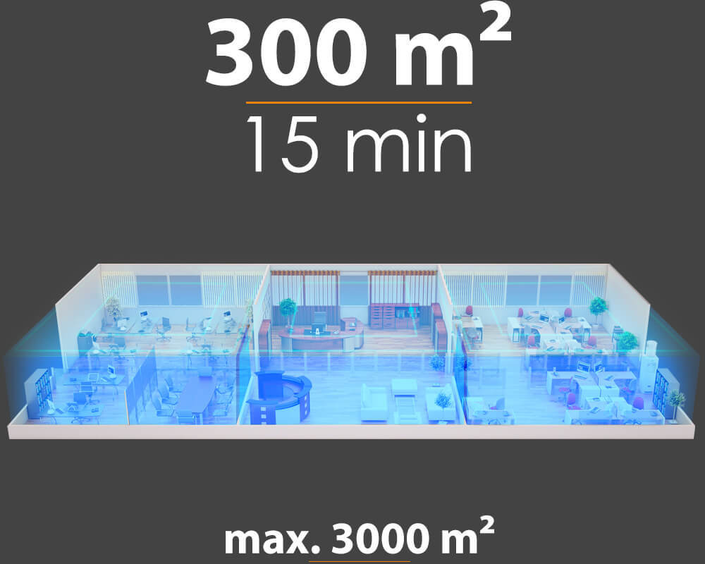 El Ozono (O3) es un elemento presente en la naturaleza. Es un gas natural cuya molécula está compuesta por 3 átomos de Oxígeno. Es un potente oxidante inocuo para seres vivos a bajas concentraciones, pero letal para los microorganismos. Al ser un gas muy volátil no se puede envasar ni transportar, y la producción debe de ser in situ. Genera 3500 mg/h de Ozono O3 y Oxígeno enriquecido, con un poder de limpieza 3.000 veces superior al cloro. El área de alcance de acción del cañón, siempre en función del tiempo y la calidad del aire, es de 500 m2. Este dispositivo ha sido diseñado especialmente para ofrecer las máximas garantías y una total eficiencia ante las altas exigencias de la limpieza a fondo en entornos profesionales. Especialmente diseñado para grandes superficies, y espacios especialmente sensibles: centros clínicos, talleres, consultas, laboratorios, centros de atención al cliente, grandes superficies comerciales, hostelería y espacios amplios de almacenaje o cualquier otro tipo de actividad profesional. Diseño industrial resistente que combina los mejores materiales con la más Alta Tecnología de Generación de Ozono. Estructura robusta con agarre para un transporte fácil y aprovechar la emisión en diferentes estancias. Durabilidad y funcionalidad profesional. Benefíciate del poder de desinfección de nuestro Generador de Ozono manteniendo un entorno puro y seguro. FABRICANTE MIEMBRO DE LA ASOCIACIÓN EUROPEA DE COMERCIO DE OZONO (EUOTA), formada por empresas punteras del Sector Tecnológico relacionado con los Generadores de Ozono, cuya finalidad es contribuir a mantener y respetar la Regulación Internacional vigente para su aplicación en Productos Biocidas. DATOS TÉCNICOS Emisión de Ozono: 3500 mg/h Área de acción: hasta 500 m2 Voltaje: 220 V Potencia: 63 W Dimensiones: 23,5x16,5x18,4 cm Peso del dispositivo: 2,6 kg