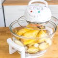Horno de convección multifunción: cocina, hierve, asa, cuece, hornea, descongela, deshidrata, seca, esteriliza, tuesta y gratina. Permite cocinar 2 alimentos a la vez sin mezclar sabores, uno en la parrilla y otro en el bol. No produce humos. Permite cocinar sin aceite, con menos grasas saturadas. Obtiene comidas más saludables que al freír o saltear. Temporizador de 60 minutos. Temperatura regulable hasta 250ºC. Cocina de forma homogénea con el aire que envuelve los alimentos, consiguiendo unos resultados más tiernos y sabrosos.