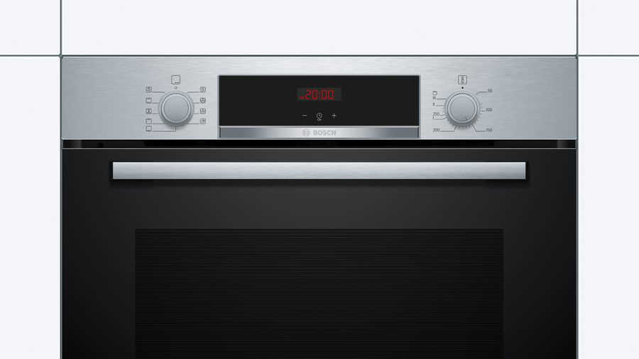 Bosch Serie 4 HBA512ES0. Tamaño del horno: Medio, Tipo de horno: Horno eléctrico, Total capacidad interior, horno (s): 71 L. Tipo de instalación: Integrado, Color del producto: Acero inoxidable, Tipo de control: Giratorio. Tipo de reloj: Electrónico. Clase de eficiencia de energía: A, Consumo de energía (convencional): 0,97 kWh, Consumo de energía (convección forzada): 0,81 kWh. Cantidad de lámparas: 1 lámpara(s)