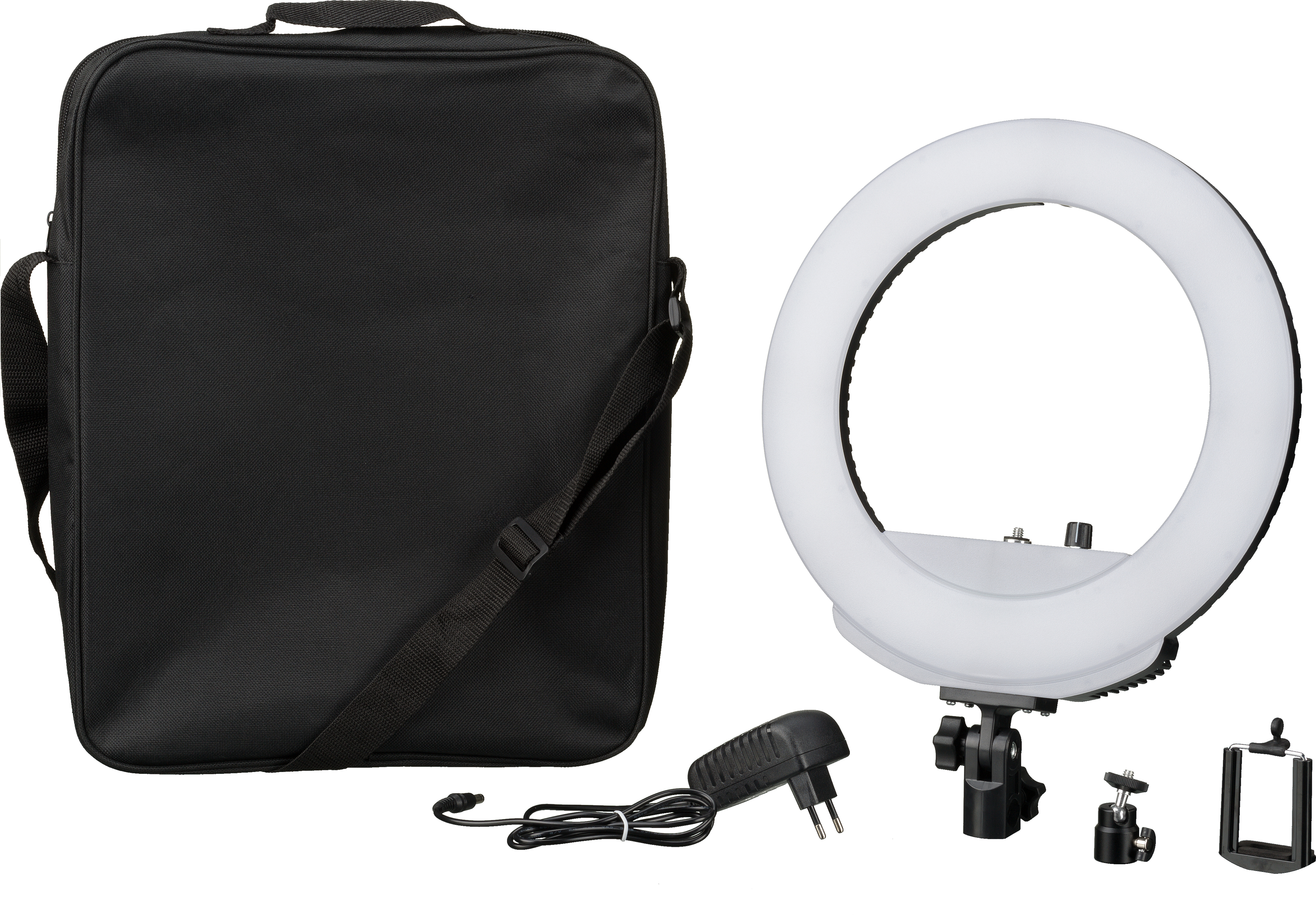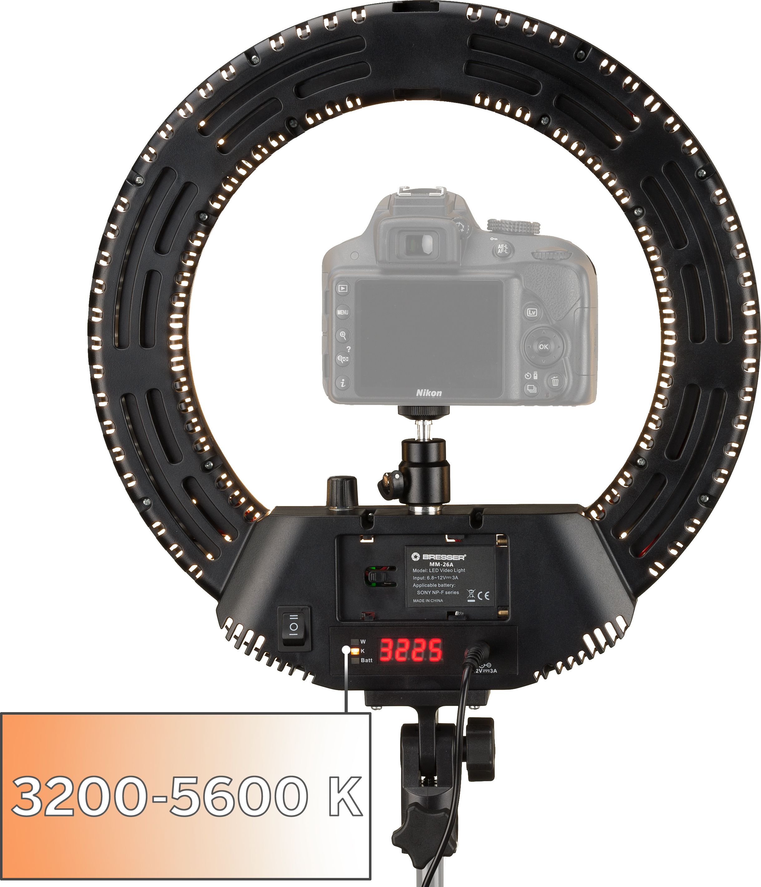 Gracias a las posibilidades de ajuste individual de la lámpara de anillo LED bicolor BRESSER MM-26A, resulta facilísimo hacer retratos perfectamente iluminados..BRILLO.Con los 240 LED que la componen, la lámpara de anillo proporciona una potencia de radiación de 24 W, y el brillo se puede regular sin intervalos del 0 % al 100 %, con un brillo máximo de 5000 lux a un metro de distancia..TEMPERATURA DE COLOR.Dependiendo del color de la luz (más bien cálido o más bien frío), obtendrá un ambiente de la imagen diferente. Por supuesto, esto también puede generarlo posteriormente mediante una laboriosa edición de las imágenes. O fotografiando directamente con la luz adecuada. Para ello, la temperatura de color de la lámpara de anillo LED se puede ajustar también sin intervalos entre 3200 Kelvin y 5600 Kelvin..PANTALLA LCD.Es estupendo que la luz de la lámpara de anillo se pueda adaptar fácilmente a las circunstancias de iluminación y al resultado deseado. Y lo mejor es que se puede hacer a través de la pantalla LCD en la parte trasera, mediante unos valores concretos que, por tanto, se pueden reproducir siempre con exactitud. Esto le permite probar distintos ajustes e introducir finalmente con seguridad los parámetros para sus ajustes favoritos..CÁMARA O SMARTPHONE.La lámpara de anillo LED con un diámetro interior de 21,5 cm se suministra con un cabezal esférico pequeño, con el cual se puede colocar la cámara directamente en el centro de la lámpara de anillo. Hoy en día, quienes prefieren fotografiar con el smartphone podrán disfrutar del soporte para smartphone..ALIMENTACIÓN ELÉCTRICA.Una fuente de alimentación está incluida en el suministro. Para poder usarla independientemente de una toma de corriente, la lámpara de anillo tiene además una conexión para batería recargable..ESPECIFICACIONES.Lámpara de anillo LED con una potencia de 24 vatios.Temperatura de color: de 3200 K a 5600 K (luz diurna).Brillo atenuable.Intensidad lumínica a 1 metro: 5000 lux.Índice de reproducción de los colores 98 %.240 LED.Horas de iluminación LED: 50 000 horas.Ángulo de radiación 120 grados.Diámetro exterior 30,5 cm.Diámetro del orificio 21,5 cm.Peso: 510 g.CONTENIDO DEL SUMINISTRO.Lámpara de anillo.Cabezal esférico.Soporte para teléfono móvil.Adaptador de red 12 V/6,8 A.Bolsa