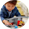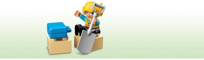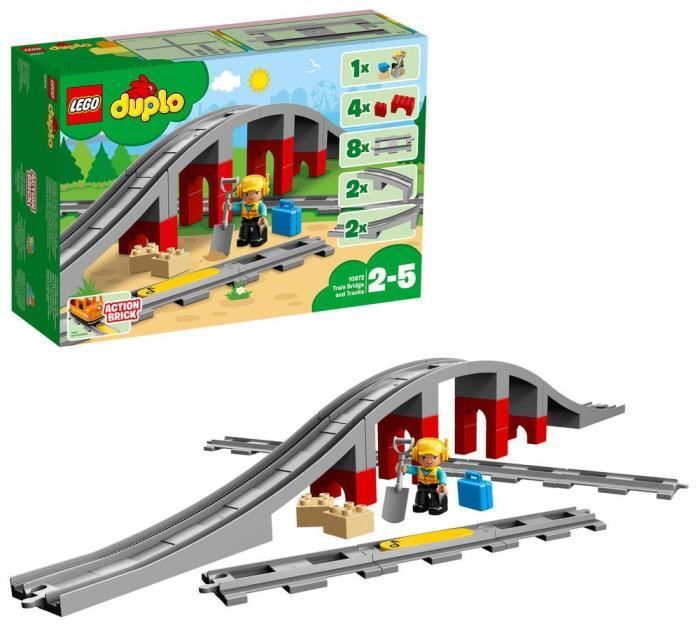 El gran puente y los rieles, así como la figura del trabajador de la construcción DUPLO se pueden combinar con un juego de trenes DUPLO. El ladrillo de acción está diseñado para activar la bocina de cualquier tren DUPLO compatible.