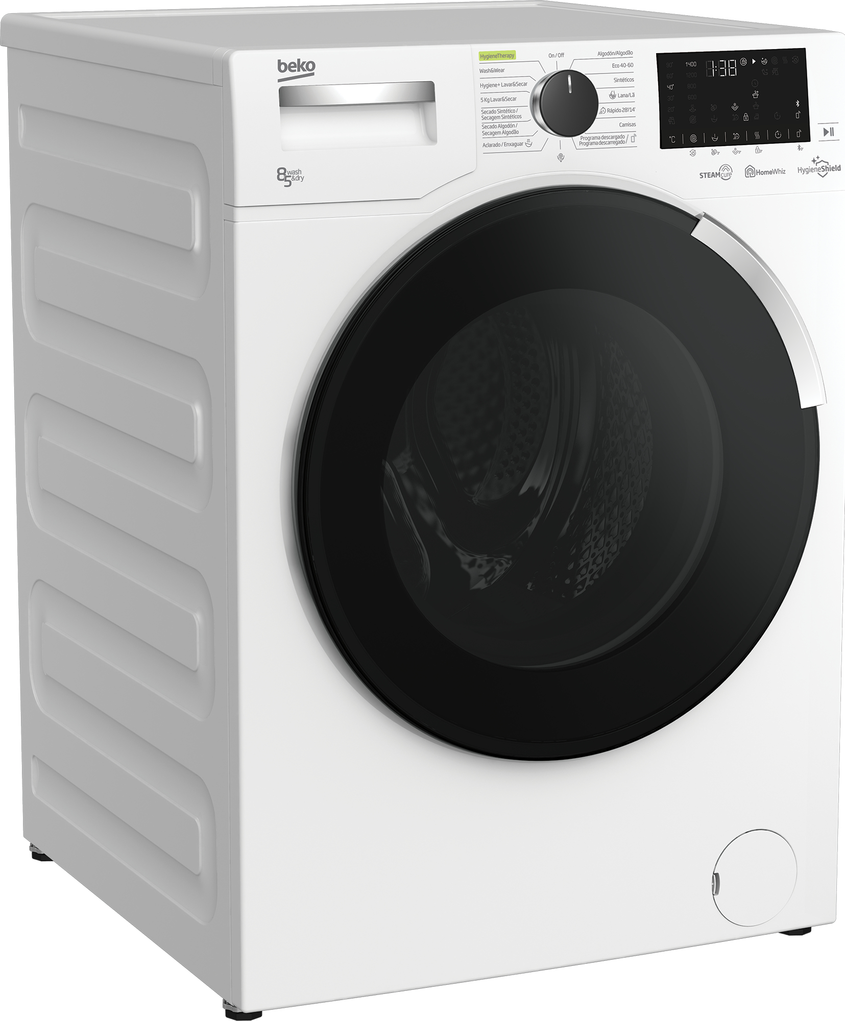 Beko HTV 8736 XSHTR. Tipo de carga: Carga frontal, Tipo de instalación: Independiente, Color del producto: Blanco. Capacidad de nominal (lavado y secado): 5 kg, Máxima velocidad de centrifugado: 1400 RPM, Clase de secado por giro: B. Clase de eficiencia energética (lavado): C, Clase de eficiencia energética (lavado y secado): D, consumo de agua de lavado: 40 L. Profundidad: 590 mm, Ancho: 600 mm, Altura: 840 mm