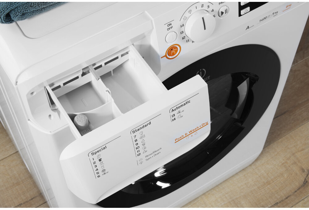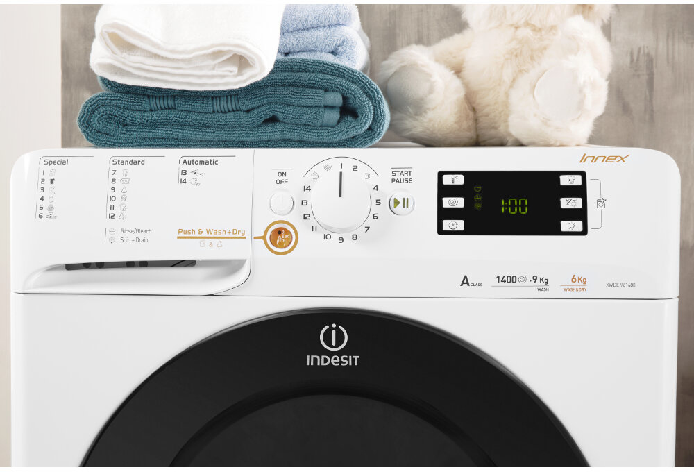 Indesit XWDE 961480X WKKK EU. Tipo de carga: Carga frontal, Tipo de instalación: Independiente, Color del producto: Blanco. Capacidad de secado: 6 kg, Máxima velocidad de centrifugado: 1400 RPM, Clase de lavado: A. Clase de eficiencia de energía: A, Consumo de energía por ciclo de lavado: 1,17 kWh, consumo de agua de lavado: 60 L. Ancho: 595 mm, Profundidad: 540 mm, Altura: 850 mm