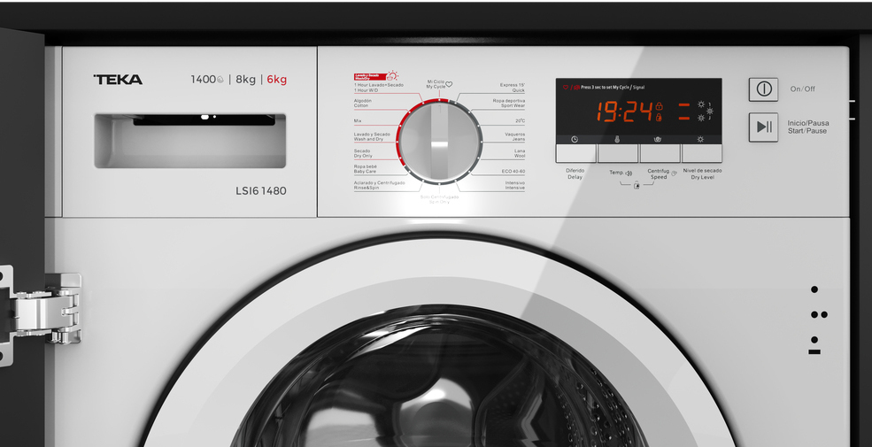 Teka LSI6 1480. Tipo de carga: Carga frontal, Tipo de instalación: Integrado, Color del producto: Blanco. Capacidad de nominal (lavado y secado): 8 kg, Máxima velocidad de centrifugado: 1400 RPM, Clase de secado por giro: B. Longitud de manguera de entrada: 1 m, Longitud de manguera de salida: 1,6 m. Clase de eficiencia energética (lavado): B, Clase de eficiencia energética (lavado y secado): E, consumo de agua de lavado: 90 L. Profundidad: 540 mm, Ancho: 595 mm, Altura: 825 mm