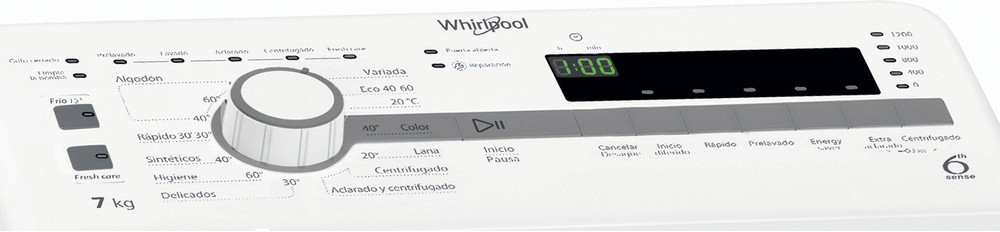 TECNOLOGÍA 6TH SENSE\n\nDescubra el cuidado perfecto. Los sensores inteligentes 6th SENSE adaptan los recursos según el tamaño y tipo de carga, ofreciendo optimización de tiempo, energía y agua.\n\nHIGIENE 60º\n\nEl nuevo programa Higiene 60° es un ciclo de 150 minutos que elimina el 99% de las bacterias de forma cuidadosa y eficaz.\n\nFRESHCARE\n\nRopa fresca y limpia. La opción FreshCare proporciona un delicado ciclo de secado, cuando el de lavado está finalizado, para que tus prendas estén frescas, secas y listas para ti.\n\nPUERTA CON SOFTOPENING\n\nCarga y descarga sin esfuerzo. La apertura suave de la puerta de tu lavadora permite una carga y una descarga fáciles como nunca.\n\nDRUM UP\n\nDescargar sin esfuerzo. Descarga tu lavadora fácilimente gracias a la función Drum Up, que automáticamente reposiciona el tambor cuando el ciclo termina, para una carga facilitada.\n\nOPCIÓN RAPID\n\nResultados excelentes, más velozmente.\n\n1200 RPM\n\nExtraordinaria velocidad. Esta lavadora Whirlpool ofrece una velocidad de centrifugado de 1200 revoluciones por minuto.\n\nEFICIENCIA ENERGÉTICA E\n\nGran eficiencia energética. Con su calificación energética E, esta lavadora Whirlpool te permitirá disfrutar tanto de un gran rendimiento como de un menor consumo energético.\n\nCAPACIDAD DE 7 KG\n\nEsta lavadora Whirlpool dispone de un tambor de capacidad de 7 kg para tus prendas.