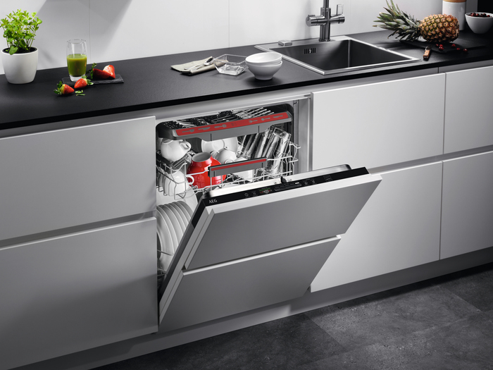 Lavavajillas integrable AirDry de 60 cm con capacidad para 14 cubiertos y display LCD con sistema QuickSelect, desconexión automática y 7 programas a 3 temperaturas, tercera bandeja MaxiFlex para cubiertos, brazo aspersor satélite, motor Inverter, 44 dB(A), Beam on Floor, Clase A+++\n\nLAVAVAJILLAS PERSONALIZABLE. LIMPIEZA EFICIENTE\nEl cajón MaxiFlex se adapta a diferentes tipos de utensilios. Desde cubertería hasta utensilios de gran tamaño. Con los separadores flexibles puedes personalizar cada carga. Los cubiertos están separados de artículos más grandes y la mayor profundidad aumenta la capacidad de cada ciclo. Lo último en limpieza eficiente y cómoda.\n\nBRAZO ASPERSOR SATÉLITE, LIMPIEZA POTENTE Y MINUCIOSA\nExperimenta una limpieza impecable con el brazo aspersor satélite de los lavavajillas AEG. Este brazo aspersor tiene un alcance tres veces mayor que un brazo estándar, gracias a su doble rotación. Así, el agua llega hasta el último rincón para una limpieza completa.\n\nSISTEMA QUICKSELECT, CONFIGURA LOS AJUSTES DEL PROGRAMA CON FACILIDAD DESLIZANDO EL DEDO POR EL SELECTOR\nQuickSelect te ofrece control total sobre lavavajillas. Selecciona la duración del ciclo con el panel selector deslizante y las demás opciones con un solo toque. El lavavajillas se ocupa a partir de ahí. Limpieza impecable de toda la vajilla y a medida, justo como tú la necesitas.\n\nAIRDRY, MAXIMIZA EL SECADO Y REDUCE EL CONSUMO ENERGÉTICO\nLa tecnología AirDry abre la puerta del lavavajillas automáticamente unos 10 cm en la última fase del ciclo, así se crea una corriente natural de aire que maximiza el secado. Ahorra tiempo, reduce el coste energético y ofrece unos resultados implecables incluso en recipientes de plástico.\n\nBEAM ON FLOOR, COMPRUEBA DE UN SOLO VISTAZO SI EL CICLO HA TERMINADO\nEste lavavajillas tiene una forma inteligente de mantenerte informado sobre el estado del ciclo. Su tecnología Beam on floor proyecta una luz roja en el suelo mientras dura el ciclo. Cuando termina, cambia a una luz verde. Sencillo y eficaz.