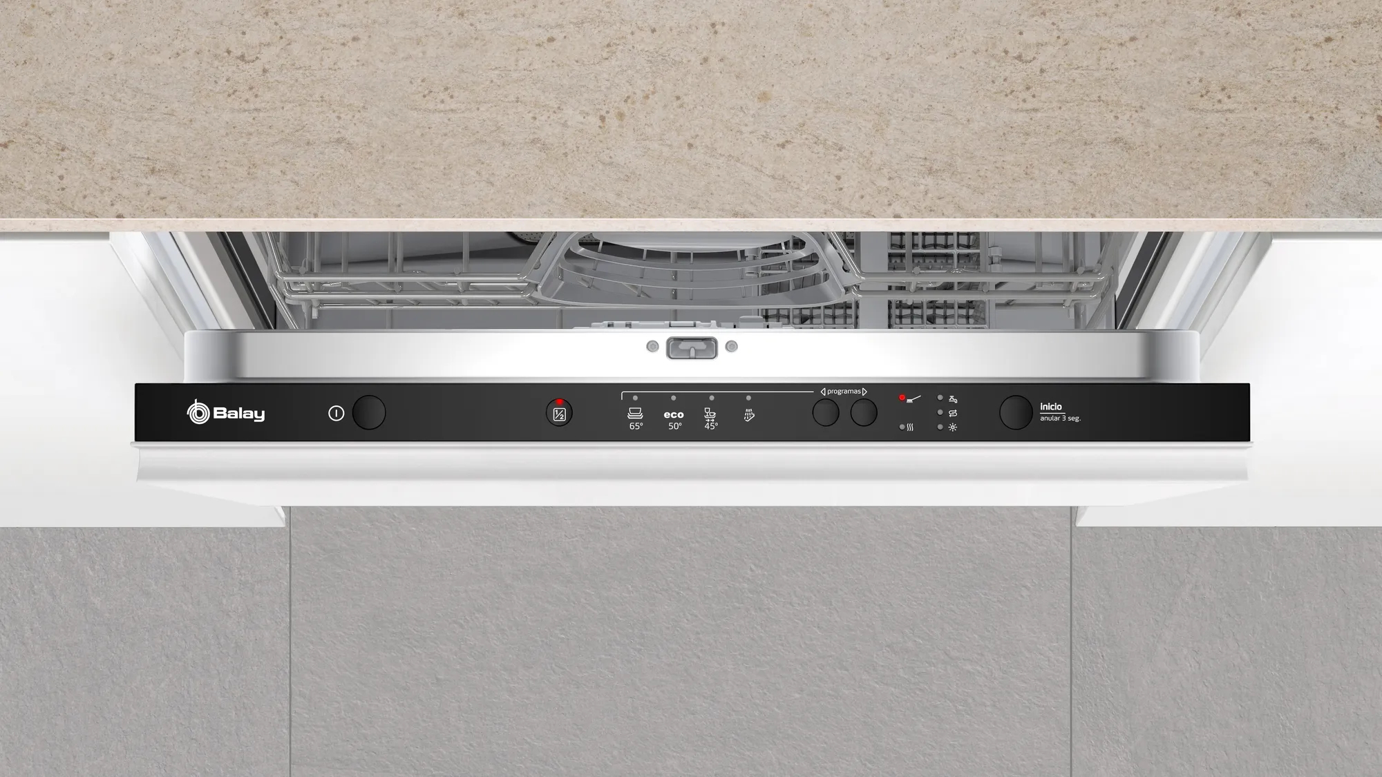 Garantía Balay: 10 años de garantía total de la cuba.\nCuando fabricamos un lavavajillas Balay no solo queremos ofrecerte buenos resultados de lavado. También queremos que lo disfrutes con tranquilidad, sabiendo que nunca vas a tener que hacer frente a una indeseable fuga de agua. Por eso, podemos asegurarte ¡durante 10 años! que la cuba ha sido fabricada con el máximo rigor. Porque lo único que debe salir de tu lavavajillas son platos relucientes.\n\nInstalación en alto de lavavajillas integrables: todo tu alcance.\nEs una posibilidad que Balay ofrece para sus lavavajillas integrables y que será muy bien recibida por tu espalda, si te decides a hacerlo. La altura idónea está entre 30 y 40 cm del suelo. Su ventaja es, indudablemente, una mayor facilidad para cargar y descargar la vajilla, así como para reponer la sal.\n\nMotor ExtraSilencio: mayor eficiencia y mínimo ruido del lavavajillas.\nAsí lo pensamos en Balay y por eso incorporamos el motor ExtraSilencio con tecnología Inverter, que prescinde de las escobillas tradicionales y reduce el rozamiento. Esto no solo consigue minimizar el nivel de ruido, sino que además, alarga la vida útil del motor y aumenta su eficiencia. Algo que agradecen tanto tus oídos como tu bolsillo. ¿A que suena bien?\n\nEncuentra el espacio que tu vajilla necesita\nLas varillas abatibles de las cestas te dan tanta flexibilidad que parece que se multiplique el espacio en el lavavajillas.\n\n“Media carga”: lavar con menos platos no es ningún derroche.\n¿Cuántas veces has tenido que esperar a llenar el lavavajillas para ponerlo en macha? Esto se ha acabado gracias a la función “Media carga”, que permite aprovechar al máximo el agua, la energía, el detergente y el tiempo, para lavar menos cantidad de vajilla con los mejores resultados. Basta con pulsar una tecla para reducir el consumo hasta en un 20%. Además, podrás distribuir la carga en ambas cestas, colocando cada pieza donde más te convenga.\n\nPrograma Prelavado\nOlvídate de aclarar los platos antes de meterlos en el lavavajillas, elige el programa Prelavado.\n\nPrograma “ECO”: cuida los recursos, con el mejor resultado.\nCuando tengas que fregar la vajilla y los cubiertos, y no estén muy sucios, pon el programa “ECO”, que lava optimizando el consumo de agua y energía. Tus utensilios de cocina quedarán como nuevos ya que todos los parámetros se ajustan al grado de suciedad y carga de la vajilla, para obtener el mejor resultado sin gastar más de lo necesario.\n\nIntegración: un lavavajillas perfectamente adaptado a su entorno.\nTu lavavajillas pasará inadvertido incorporándole una puerta de mueble. El cuidado diseño y las numerosas posibilidades de instalación garantizan un resultado increíblemente estético, y perfectamente integrado en tu cocina.\n\nAquaStop: un sistema de protección antifugas garantizado de por vida.\nEs el único sistema antifugas del mercado que ofrece una garantía durante toda la vida