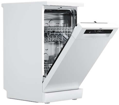Teka DFS 24650. Tipo de instalación: Independiente, Talla del producto: Estrecho (45 cm), Color de la puerta: Blanco. Número de cubiertos: 9 cubiertos, Clase de emisión de ruido: C, Nivel de ruido: 47 dB. Clase de eficiencia de energía: E, Consumo de agua por ciclo de lavado: 9 L, Consumo de energía por 100 ciclos: 70 kWh. Ancho: 448 mm, Profundidad: 600 mm, Altura: 845 mm