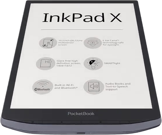 Pocketbook InkPad X. Diagonal de la pantalla: 26,2 cm (10.3""), Tecnología: E Ink Carta, Resolución de la pantalla: 1440 x 1872 Pixeles. Formatos de texto soportados: DOC,DOCX,EPUB DRM,HTM,HTML, Formatos de audio soportados: MP3,OGG, Formatos de imagen soportados: BMP, JPEG, PNG, TIFF. Capacidad de almacenamiento interno: 32 GB, Capacidad de RAM: 1000 MB. Frecuencia del procesador: 1000 MHz. Conector USB: USB Tipo C, Auriculares: 3,5 mm, Tipo de interfaz: USB 2.0