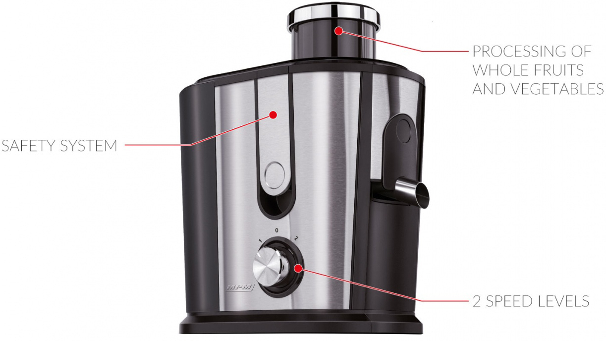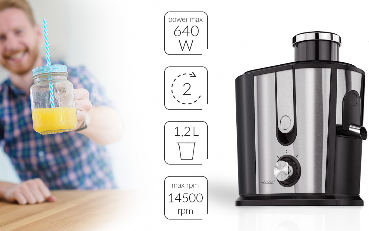Los zumos frescos son una fuente de vitaminas y minerales naturales, y también son una combinación perfecta para una comida y calmar la sed en un día caluroso. El exprimidor MSO-07M le ayudará a prepararlos, con una abertura suficientemente grande para servir frutas y verduras enteras.Práctico en la vida diariaPrepara jugos refrescantes de verdura y fruta fresca con el exprimidor MSO-07M. La presencia de una gran abertura de alimentación resultará útil para realizar tareas difíciles. Puedes meter fácilmente frutas y verduras enteras en él, sin necesidad de pelarlas y cortarlas en trozos más pequeños.Un diseño robustoLa carcasa del exprimidor MSO-07M está hecha de acero inoxidable de alta calidad. El filtro también funcionará eficientemente durante muchos años. La alta potencia del dispositivo permitirá alcanzar grandes resultados de trabajo en un instante. El MSO-07M tiene un control de velocidad de 2 etapas, que le permite ajustar la velocidad de trabajo a sus necesidades y la dureza de los componentes. El pequeño tamaño facilita el almacenamiento y la base antideslizante garantiza la seguridad del equipo durante su uso. El cierre de goteo permite verter el jugo directamente en los vasos en la cantidad exacta, sin ensuciar la parte superior.Jarra de zumoEl exprimidor MSO-07M viene con una práctica jarra de jugo con un separador de espuma de 350 ml.
