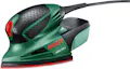 Bosch PSM 100 A. Tipo de lijadora: Multilijadora, Sistema de fijación de la hoja de lija: Velcro, Color del producto: Negro, Verde, Rojo. Número de carreras en vacío (máx.): 26000 OPM, Diámetro orbital oscilante: 1,4 mm, Excentricidad: 0,7 mm. Fuente de energía: Corriente alterna. Peso: 900 g. Superficie a lijar: 0,0104 m², Potencia: 100 W, Emisión de la vibración: 6,5 m/s²