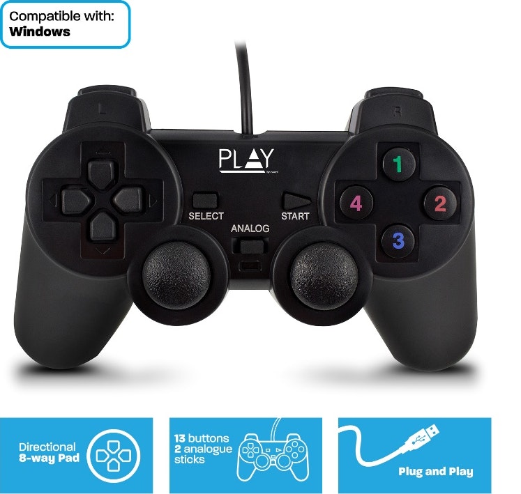 Play PL3330. Tipo de dispositivo: Gamepad, Plataformas de juego soportadas: PC, Tecnología de control para juegos: Analógico/Digital. Tecnología de conectividad: Alámbrico, Interfaz del dispositivo: USB 2.0. Color del producto: Negro, Longitud de cable: 1,5 m. Tipo de embalaje: Caja