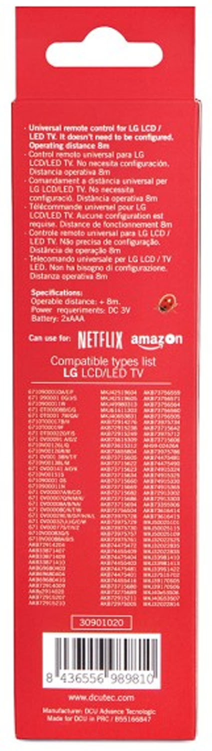 Mando a distancia universal DCU 30901020 acabado en color negro, compatible con televisores LG LCD/LED, distancia operable: 8 metros, fácil de usar, no necesita configuración, con botón para Netflix y Amazon Prime, requisitos de potencia: DC 3V, batería: 2 pilas AAA (no incluidas)