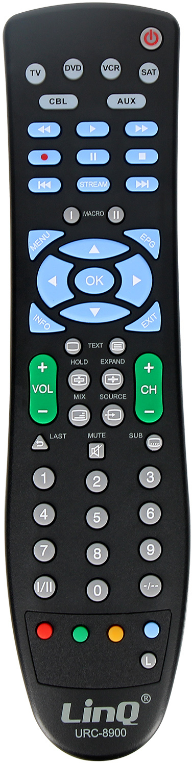 Mando a distancia universal multifunción LinQ para TV vía satélite DVD CBL Audio VCR. Botones completos adaptados a cada aparato. Sin pérdida de ajustes de códigos ni funciones. Distancia de transmisión de hasta 10 m.Características y Puntos fuertes: Mando a distancia universal 6 en 1 LinQ para controlar fácilmente tus aparatos electrónicosUn accesorio preprogramado que combina las funciones de control de tu televisor, reproductor de DVD, equipo de audio, receptores satélite, etc.Botones completos y acceso directo para facilitar el uso del mando a distanciaNo se pierden los ajustes del código ni las funciones gracias a la memoria permanente
