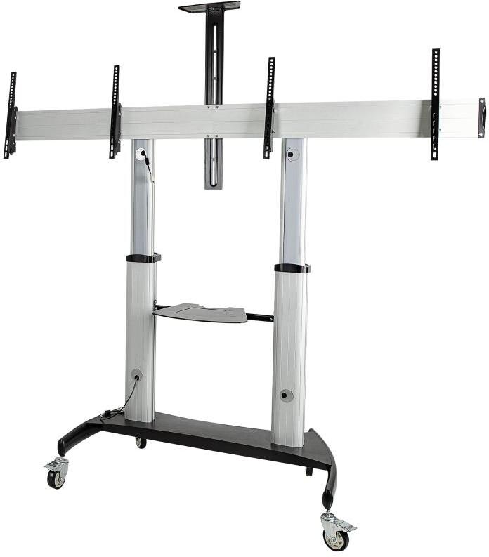 Este soporte de TV mOvil doble le permite crear un centro multimedia AV rodante que es fAcil de mover por las aulas, oficinas, salas de juntas, reuniones o entornos de aprendizaje. Para una mayor estabilidad y seguridad, el carro mOvil ha sido diseñado con una gran base de 1,22 m x 0,71 m que le permitirA montar dos pantallas de 37” a 60” y hasta 110 lb/cada una de peso. Totalmente adaptable a su configuraciOn Este soporte de TV mOvil con soporte se adaptarA a las diferentes configuraciones que pueda encontrar en su espacio de oficina. Puede ajustar la altura de su pantalla desde 1,2 m hasta 1,68 m desde el centro del televisor hasta el suelo, y los indicadores de ajuste incluidos le permiten realizar ajustes precisos para conseguir la altura de visualizaciOn ideal. AdemAs, los indicadores de ajuste de altura facilitan la instalaciOn y le permiten anotar la altura preferida para entornos especIficos. TambiEn puede inclinar individualmente el Angulo de visiOn dentro de los +5/-10° para adaptarse mejor a su entorno y reducir el deslumbramiento. Las ruedas incluidas, que se pueden bloquear, permiten trasladar fAcilmente el soporte de TV de un lugar a otro. Almacenamiento para sus dispositivos audiovisuales Para aumentar la portabilidad y la personalizaciOn, este carro mOvil universal ofrece dos estantes para dispositivos ajustables de forma independiente (estante para la cAmara web y estante para el equipo) que soportan cada uno hasta 11lb/5kg. El estante para la cAmara web puede elevarse hasta 2,37 m, mientras que el estante para el equipo puede elevarse hasta 0,90 m desde el suelo. FabricaciOn durable La construcciOn durable del soporte de TV doble para trabajo pesado lo hace ideal para uso comercial, en ambientes con mUltiples usuarios y movimiento frecuente entre Areas. La gestiOn de cables incorporada mantiene los cables organizados y ocultos a la vista. El STNDMTVDUO estA respaldado durante 2 años por StarTech.com, incluyendo asistencia tEcnica multilingüe gratuita de por vida.