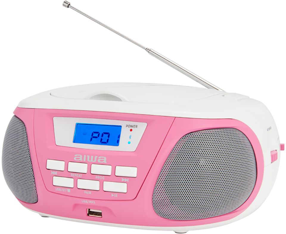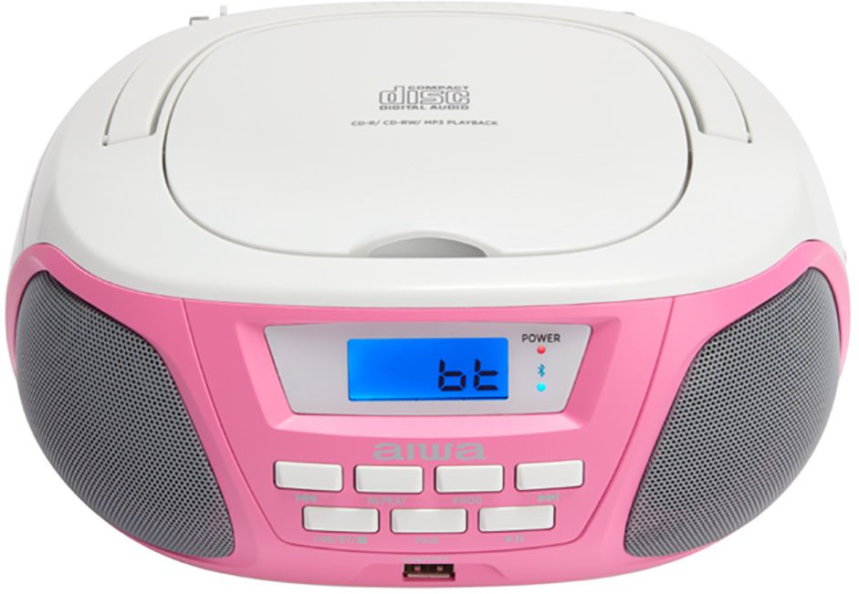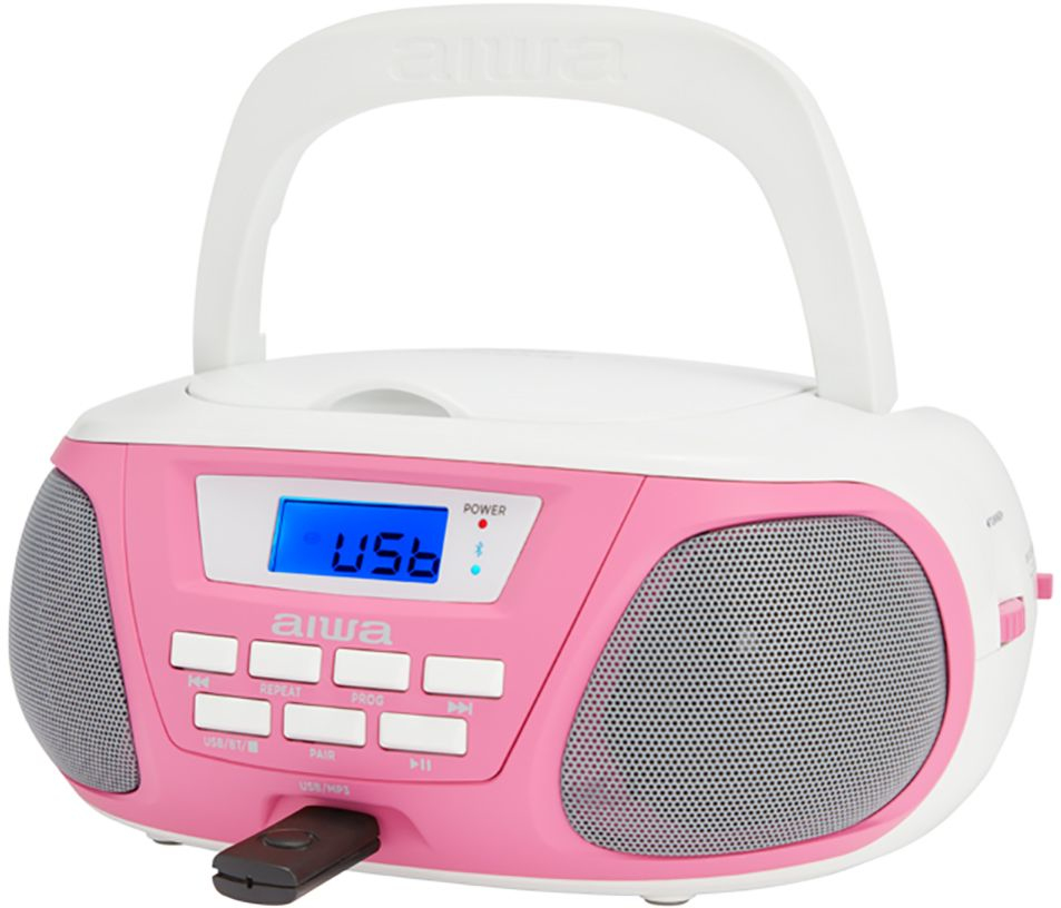 Aiwa BBTU-300PK. Tipo de sintonizador: Analógico y digital, Bandas de radio soportadas: AM, FM, MW. Tipo de unidad óptica: Jugador, Tipos de discos soportados: CD, CD-R, CD-RW, Tipo de carga en disco: Parte superior. Potencia estimada RMS: 5 W. Tipo de visualizador: LCD. Color del producto: Rosa, Blanco, Tipo de control: Botones, Giratorio, Control de volumen: Giratorio