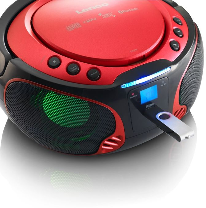 - Bluetooth\n- Reproductor de CD/MP3 con carga en la parte superior\n- Radio FM\n- Pantalla LCD\n- Reproducción USB\n- Compatible con los tipos de disco: CD, CD-R/RW\n- 2 altavoces incorporados\n- Antena telescópica\n- Funcionamiento con red y batería\n- Efectos de iluminación musicales