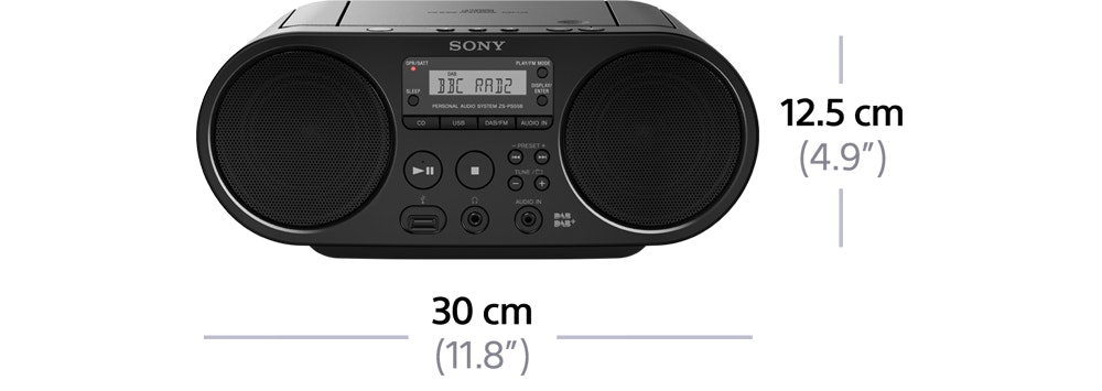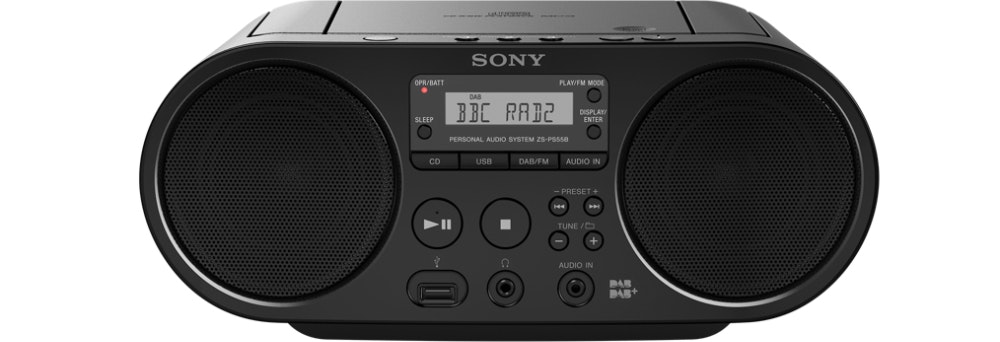 Disfruta de toda tu música con una calidad superior gracias al boombox con CD ZS-PS55B, diseñado para el uso con dispositivos USB y compatible con la mayoría de tipos de archivos de audio. Impulsa tu sonido con dos altavoces adicionales y encuentra tus tres emisoras de radio favoritas con solo tocar un botón. El intuitivo diseño te permite acceder fácilmente a todas las funciones.\n\n- Sintonizador de radio digital DAB/FM\n- Reproducción de USB\n- Permite la reproducción de CD/CD-R\n- Incluye 2 altavoces de 2 W\n- Presintoniza tres emisoras para acceder a ellas con el botón de salto directo