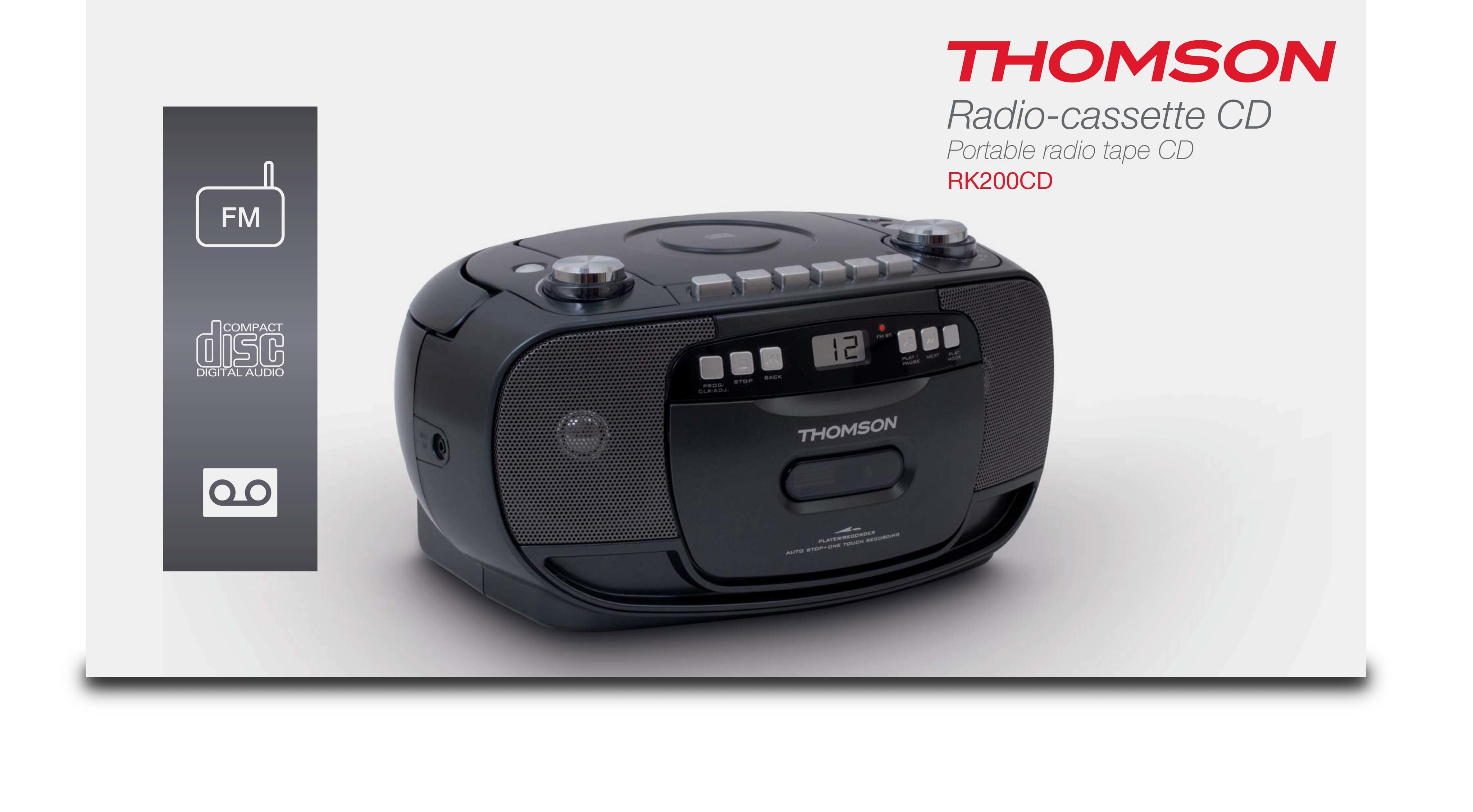 Thomson RK200CD. Tipo de sintonizador: Analógica, Bandas de radio soportadas: AM,FM, Banda FM: 88 - 108 MHz. Tipo de unidad óptica: Jugador, Tipos de discos soportados: CD. Potencia estimada RMS: 2,4 W. Tipo de visualizador: LCD. Color del producto: Negro, Control de volumen: Giratorio