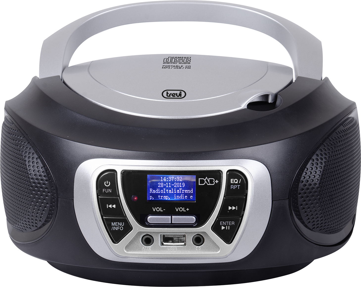 Trevi CMP 510 DAB. Tipo de sintonizador: Digital, Bandas de radio soportadas: DAB,DAB+,FM. Tipo de unidad óptica: Jugador, Tipos de discos soportados: CD,CD-R,CD-RW, Teclas de funcionamiento: Reproducir/Pausar, Skip down, Skip up, Stop. Color de luz de fondo: Azul. Color del producto: Negro, Tipo de control: Botones, Control de volumen: Botones. Auriculares: 3,5 mm