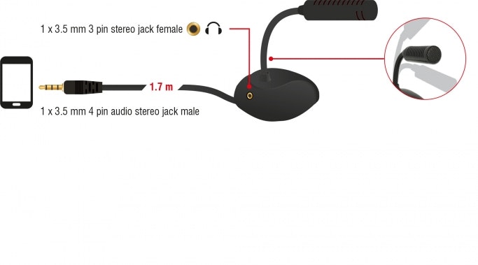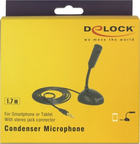 DeLOCK 65872. Tipo: Mobile phone/smartphone microphone, Sensibilidad de micrófono: -32 dB, Frecuencia de micrófono: 100 - 13000 Hz. Tecnología de conectividad: Alámbrico, Interfaz del dispositivo: 3.5 mm (1/8 ""), Longitud de cable: 1,7 m. Color del producto: Negro, País de origen: China. Ancho: 64 mm, Profundidad: 55 mm, Altura: 143 mm. Tipo de embalaje: Envase para colgar