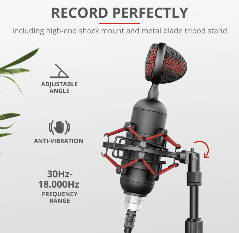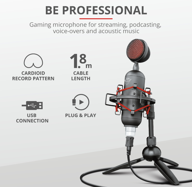 Micrófono USB para streaming\n\nMicrófono para streaming, a fin de conseguir grabaciones de alta calidad; para streaming, podcasts, locuciones y música acústica\n\nPara llevar el streaming a otro nivel\n\nSi está buscando un micrófono que se adapte a la transmisión de juegos y a las grabaciones con la más alta calidad, aquí tiene el micrófono para streaming GXT 244 Buzz de Trust. Ofrece una calidad de audio excelente al tiempo que es increíblemente fácil de utilizar. Este micrófono está diseñado para llevar el streaming y las grabaciones a otro nivel.\n\nCalidad de audio excelente\n\nDe todos los elementos que utiliza en sus grabaciones, el micrófono es el que tiene mayor efecto. Tiene que capturar voces e instrumentos con la calidad más alta posible. Por eso, el micrófono para streaming GXT 244 Buzz de Trust se ha concebido para ofrecer grabaciones de gran nitidez y riqueza en matices con una calidad prácticamente de estudio profesional.\n\nGrabación cardioide de alta precisión\n\nEl micrófono Buzz está diseñado especialmente para la grabación de voz. El patrón de grabación cardioide garantiza que se obtiene una grabación de alta calidad aislando la voz, minimizando de esta manera el sonido de fondo. Es perfecto para lograr un audio increíblemente claro, preciso y cálido durante la transmisión de gaming pero también es ideal para emitir podcasts, vlogs y grabar locuciones o instrumentos acústicos.\n\nEstabilidad máxima a prueba de golpes\n\nEl micrófono para streaming GXT 244 Buzz de Trust se ha concebido para ofrecer grabaciones estables. Su trípode de plancha metálica asegura una posición firme y mediante el montaje con tornillo universal de 5/8"" se puede acoplar a cualquier brazo de micrófono compatible. Además, su montaje puntero con efecto amortiguador neutraliza temblores de la superficie para contribuir a estabilizar la grabación, incluso si uno salta en el fragor de la batalla.\n\nFácil configuración y uso\n\nCon una sencillez de uso increíble, el Buzz se suministra con una conexión USB ""plug and play"" para conectar instantáneamente el PC o portátil. El ángulo del micrófono se puede ajustar fácilmente para conseguir la posición de grabación ideal, y gracias al cable USB de 1,8 m (extraíble), el micrófono se puede colocar en cualquier lugar del escritorio.