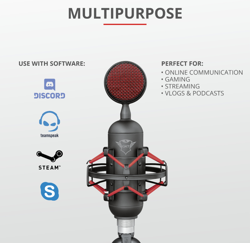 Trust GXT 244 Buzz. Tipo: Micrófono para PC, Sensibilidad de micrófono: 36 dB, Frecuencia de micrófono: 30 - 18000 Hz. Tecnología de conectividad: Alámbrico, Interfaz del dispositivo: USB. Color del producto: Negro, Rojo, Longitud de cable: 1,8 m, Sistemas operativos compatibles: Windows 7, 8, 10, Mac OS X 10.5 +. Relación señal/ruido (SNR): 79 dB. Fuente de energía: USB