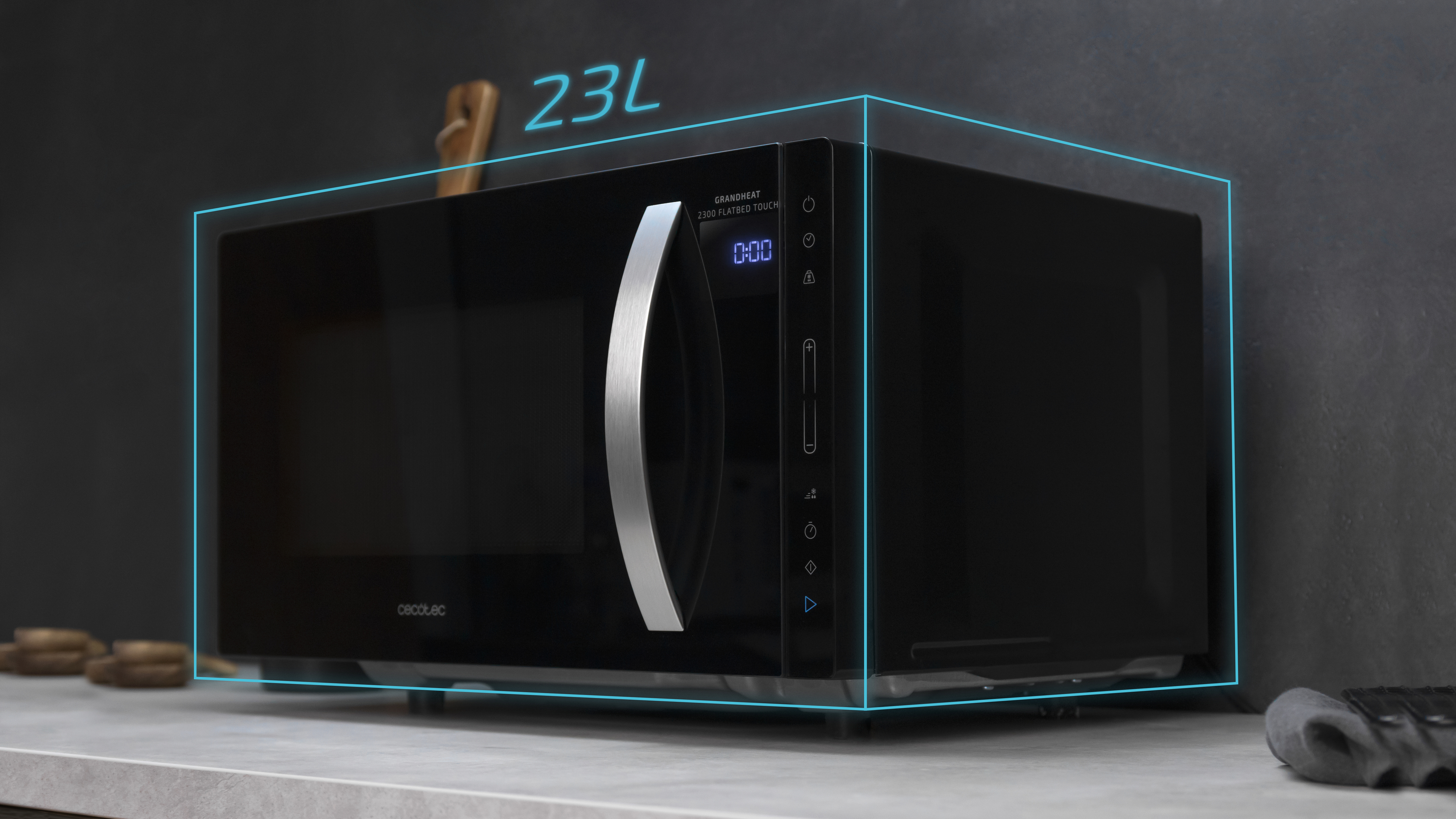 Cecotec GrandHeat 2300 Flatbed Touch. Tipo de instalación: Encimera, Tipo de producto: Solo microondas, Capacidad interior: 23 L. Programas de cocción: Patata, Carnes, Pizza, Popcorn. Carga conectada: 1270 W, Voltaje de entrada AC: 230 - 240 V, Frecuencia de entrada AC: 50 Hz. Ancho: 300 mm, Profundidad: 410 mm, Altura: 500 mm