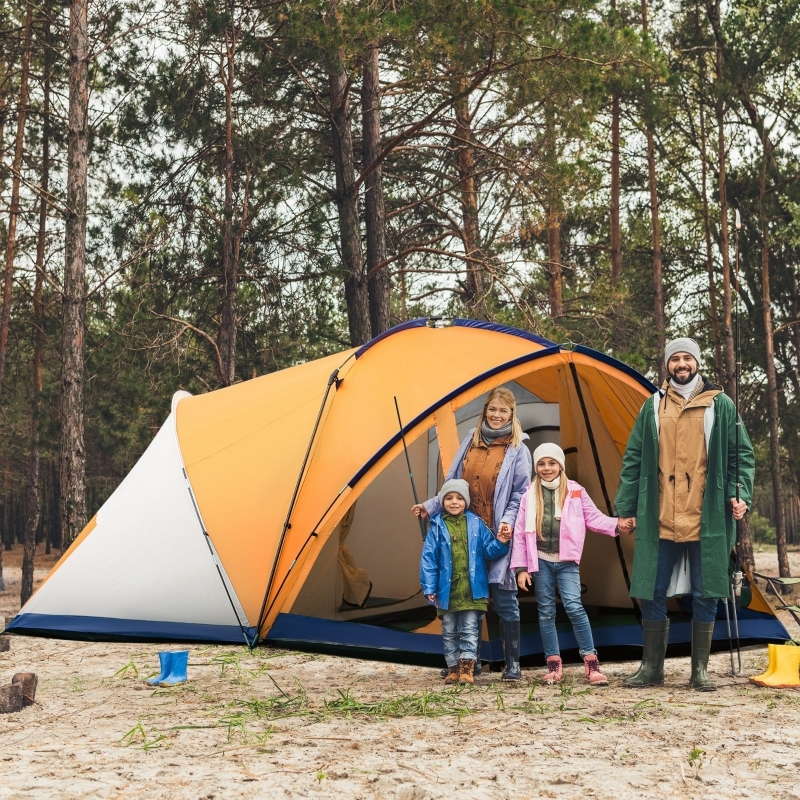 Disfruta acampando en espacios permitidos o en tu parcela de camping con esta tienda iglú familiar de Outsunny para 6 personas. Pensada para que puedas ir con amigos o en familia, tiene una entrada principal y el interior está dispuesto en 2 estancias separadas con su correspondiente puerta y ventana de malla. Fácil de montar gracias a las varillas de fibra de vidrio flexibles y con gran resistencia y cómoda de transportar con la bolsa incluida. Características - Tienda al aire libre con espacio suficiente para hasta 6 personas - Marco con varillas de fibra de vidrio, con gran flexibilidad y resistencia - Cubierta de poliéster impermeable de 2000 mm para la lluvia, resistente a la intemperie ya los rayos UV - Las ventanas ofrecen una buena ventilación y protección óptimas contra los insectos - Incluye un gancho interior en la parte superior para colgar una luz y 2 bolsillos de almacenaje - Se incluyen 16 estacas y 6 cuerdas de tensión para fijar en el suelo para mayor estabilidad - Incluye una bolsa de transporte para guardar y transportar fácil y cómodamente - No debe utilizarse en condiciones climáticas extremas - Requiere montaje Especificaciones - Color: naranja, crema y azul - Material: poliéster y fibra de vidrio - Medidas totales: 548x510x210 cm (LxANxAL) - Medidas internas: 510x300x210 cm (LxANxAL) - Medidas estando plegada: 77x30x35 cm (LxANxAL) - Puerta delantera: 210x200 cm (LxAL) - Puertas interiores: 167x96 cm (LxAL) - Bolsillos de almacenaje: 20x20 cm (LxAN) - Ventanas: 112x62 cm (LxAN) - Referencia: A20-272