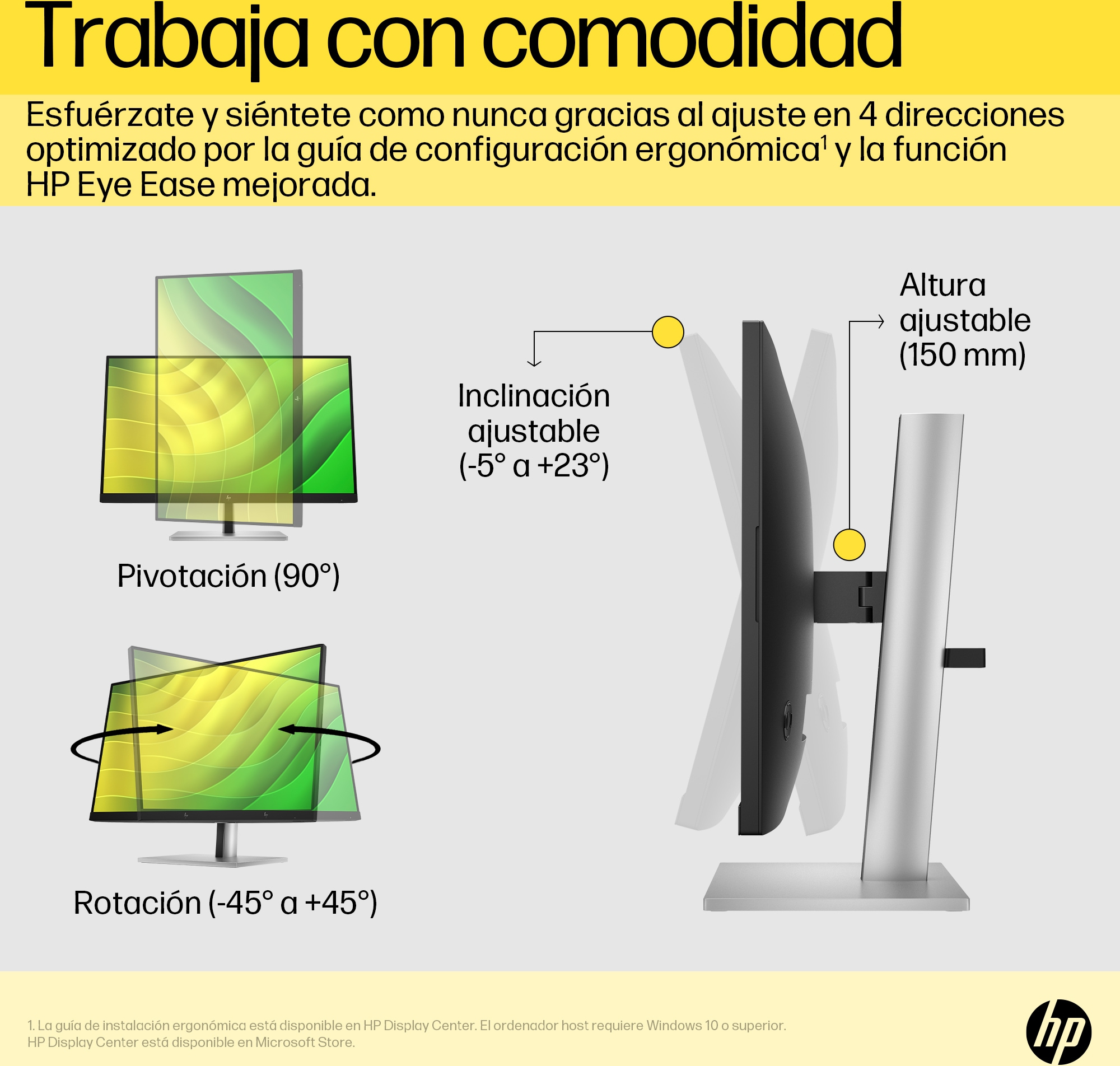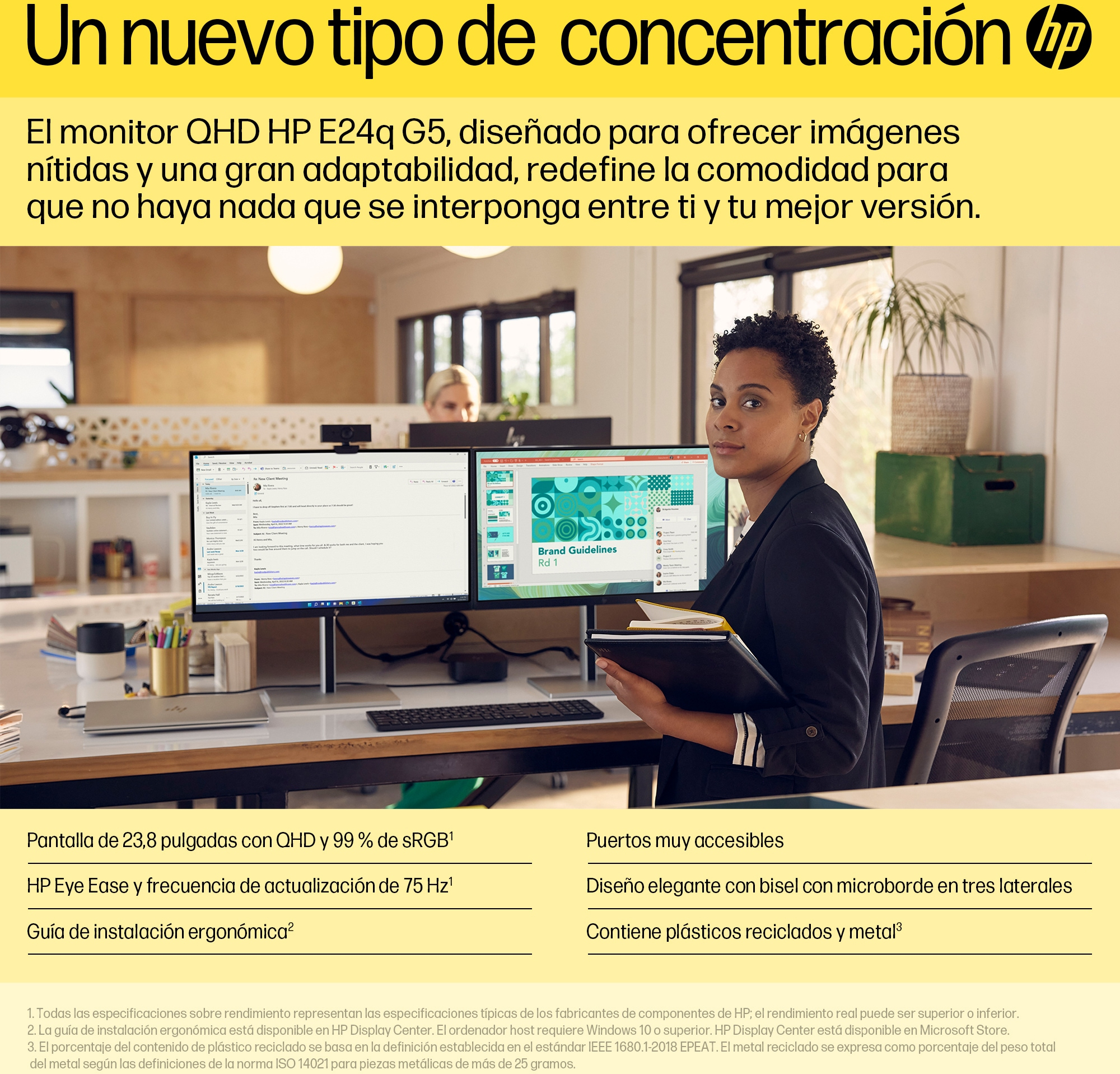 Redefiniendo los límites de la imagen\nExpresamente concebido para brindar imágenes nítidas, confort personalizado y flexibilidad real, el monitor QHD HP E24q G5 redefine el confort, para que nada se interponga entre tú y lo mejor de lo mejor. Diseñado con estilo pensando en el planeta, este monitor encaja igual de bien en tu oficina como en tu hogar.