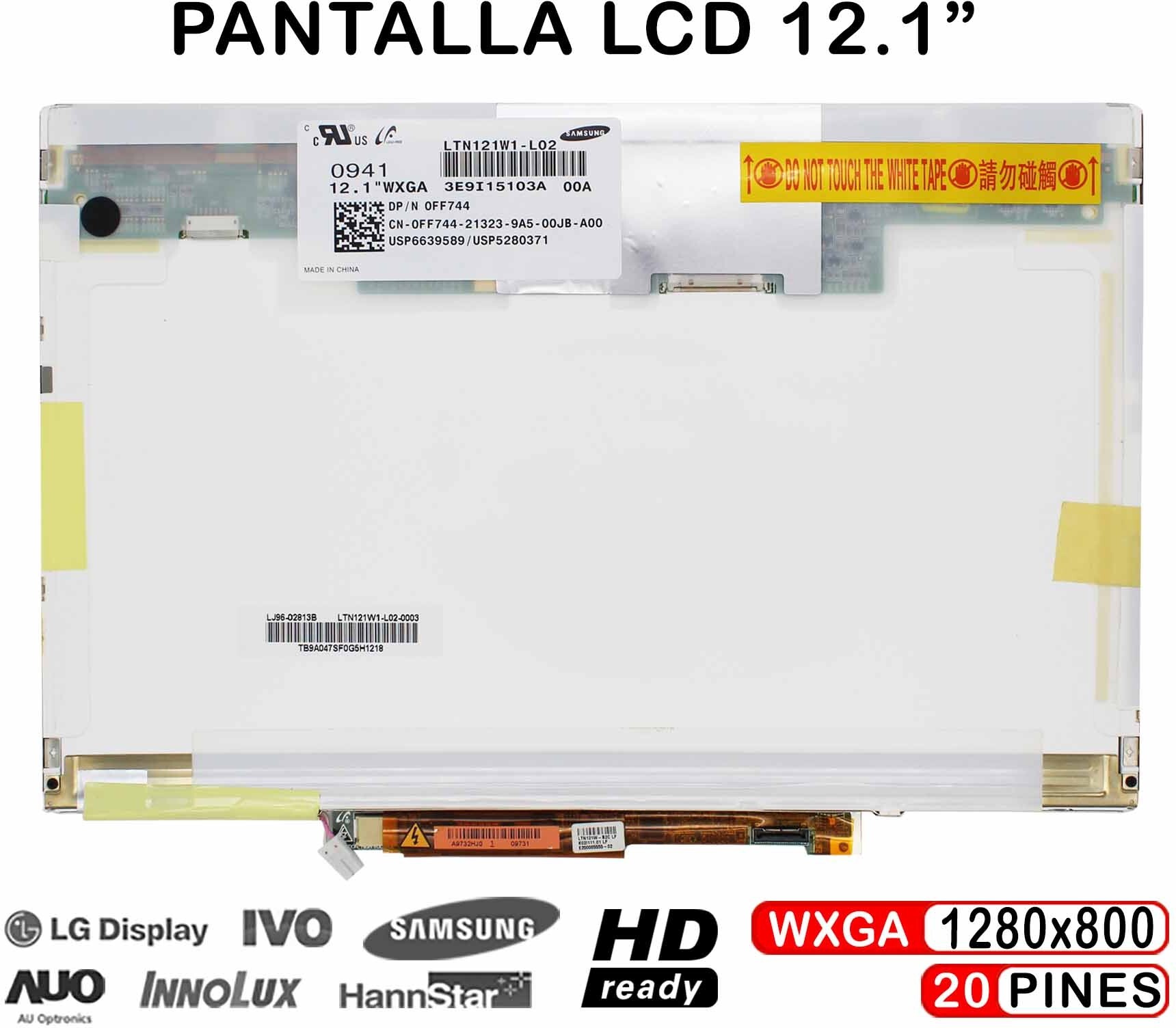 CARACTERÍSTICAS Tamaño: 12.1"" pulgadas Resolución: WXGA (1280x800) Conector: 20 pines Posición del conector: Superior derecha Números de serie compatibles: LTN121W1-L02 ¡Atención! Antes de comprar por favor asegúrese que la pantalla que necesitas es la que anunciamos. Para evitar errores y devoluciones compare su pantalla del portátil con la pantalla que mostramos en las fotos. Esta pantalla para portátil es compatible con los modelos indicados (y más).El modelo completo de su portátil lo puede ver en la parte situada debajo del mismo. Si no encuentra el modelo de su portátil o no sabe que pantalla es compatible con su portátil por favor pregunte y le informaremos con mucho gusto.