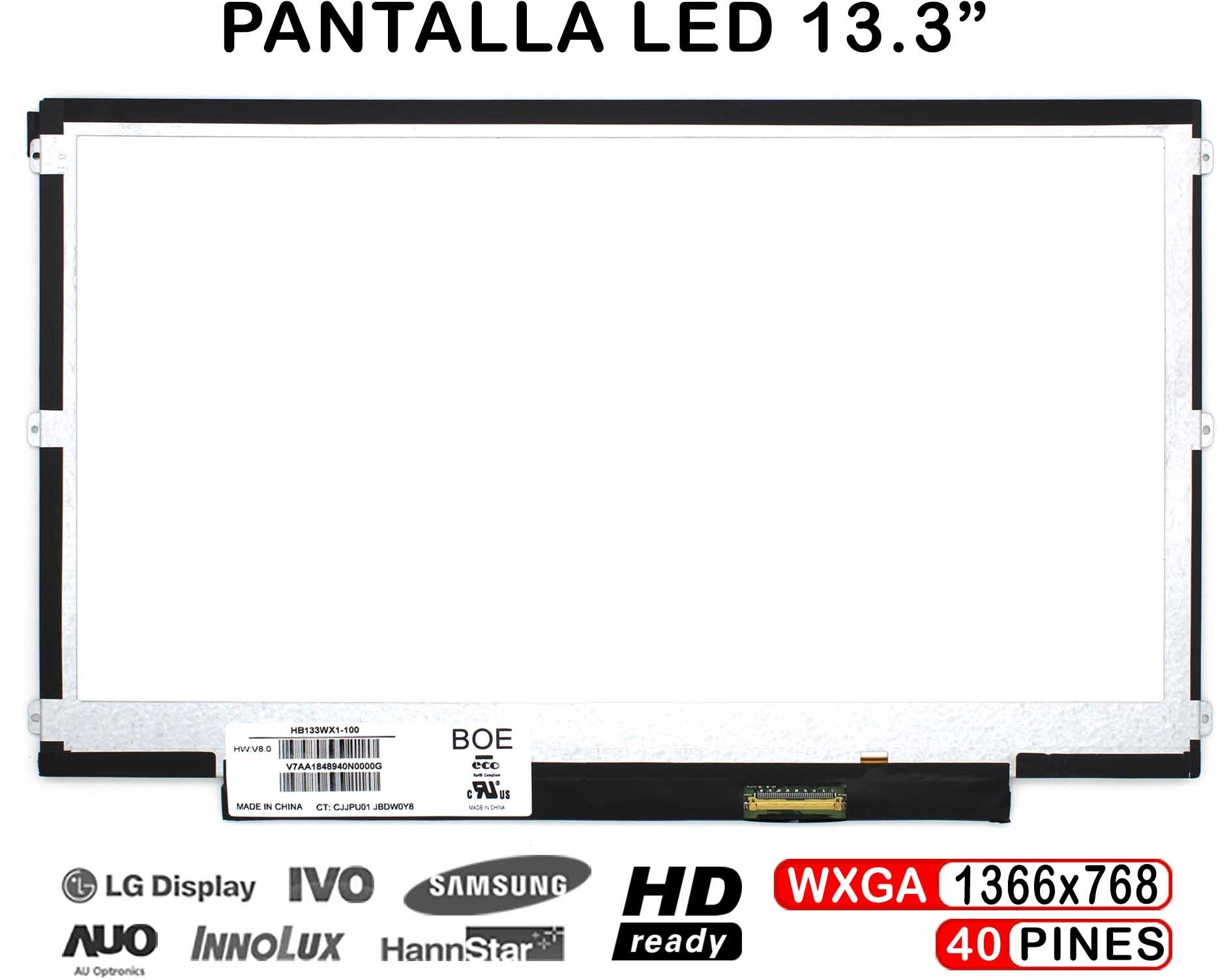 CARACTERÍSTICAS Tamaño: 13.3"" pulgadas Resolución: WXGA (1366x768) Conector: 40 pines Posición del conector: Inferior derecha Números de serie compatibles: HB133WX1-100 ¡Atención! Antes de comprar por favor asegúrese que la pantalla que necesitas es la que anunciamos. Para evitar errores y devoluciones compare su pantalla del portátil con la pantalla que mostramos en las fotos. Esta pantalla para portátil es compatible con los modelos indicados (y más).El modelo completo de su portátil lo puede ver en la parte situada debajo del mismo. Si no encuentra el modelo de su portátil o no sabe que pantalla es compatible con su portátil por favor pregunte y le informaremos con mucho gusto