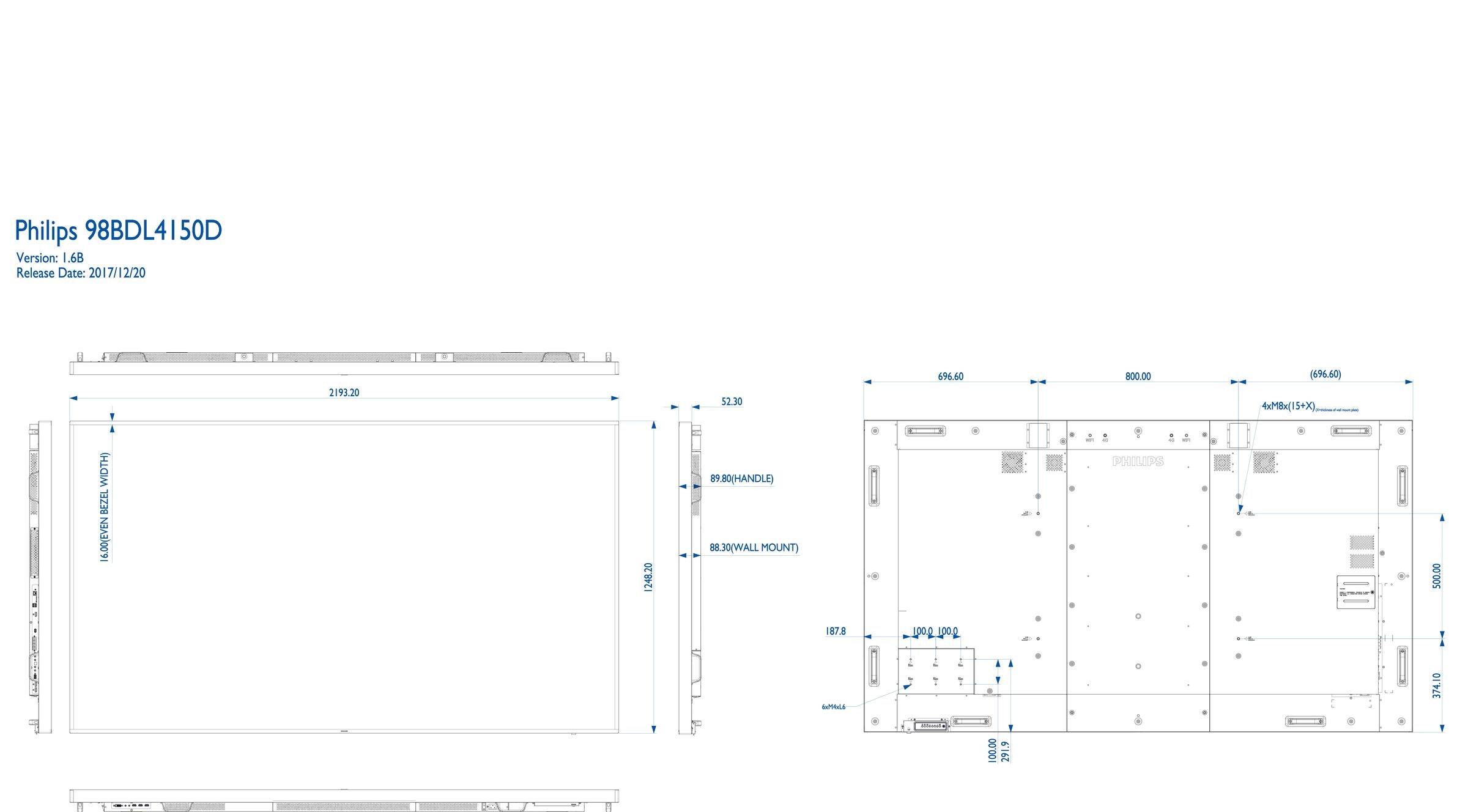 Philips Pantalla D-Line 98BDL4150D/00, Signage Solutions. Diagonal de la pantalla: 2,48 m (97.5""), Resolución de la pantalla: 3840 x 2160 Pixeles, Brillo de pantalla: 500 cd / m². Tarjetas de memoria compatibles: MicroSD (TransFlash). Potencia estimada RMS: 20 W. Diseño: Pantalla plana para señalización digital, Color del producto: Plata, Orientación: Horizontal/Vertical. Utilizar con: Universal, Idiomas OSD: Árabe, Chino simplificado, Chino tradicional, Danés, Alemán, Holandés, Inglés, Español,...