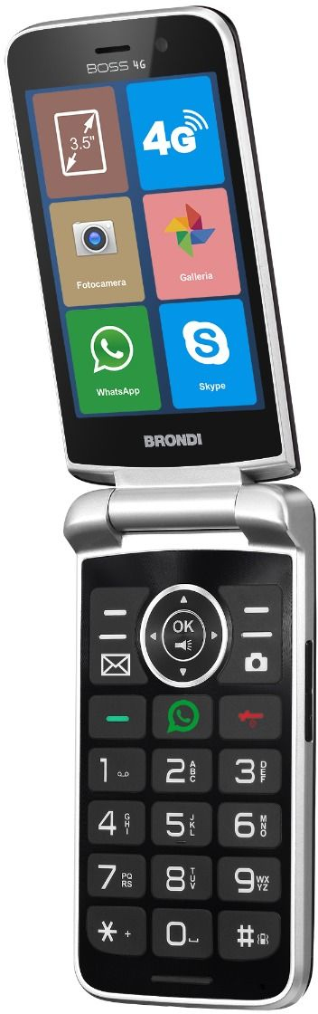 Brondi Boss 4G. Factor de forma: Móvil con tapa. Capacidad de la tarjeta SIM: SIM doble. Diagonal de la pantalla: 8,89 cm (3.5""). Resolución de la cámara trasera (numérica): 2 MP. Wifi. Bluetooth. Radio FM. Capacidad de batería: 1500 mAh, Tiempo de suspendido (2G): 170 h. Color del producto: Negro