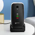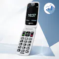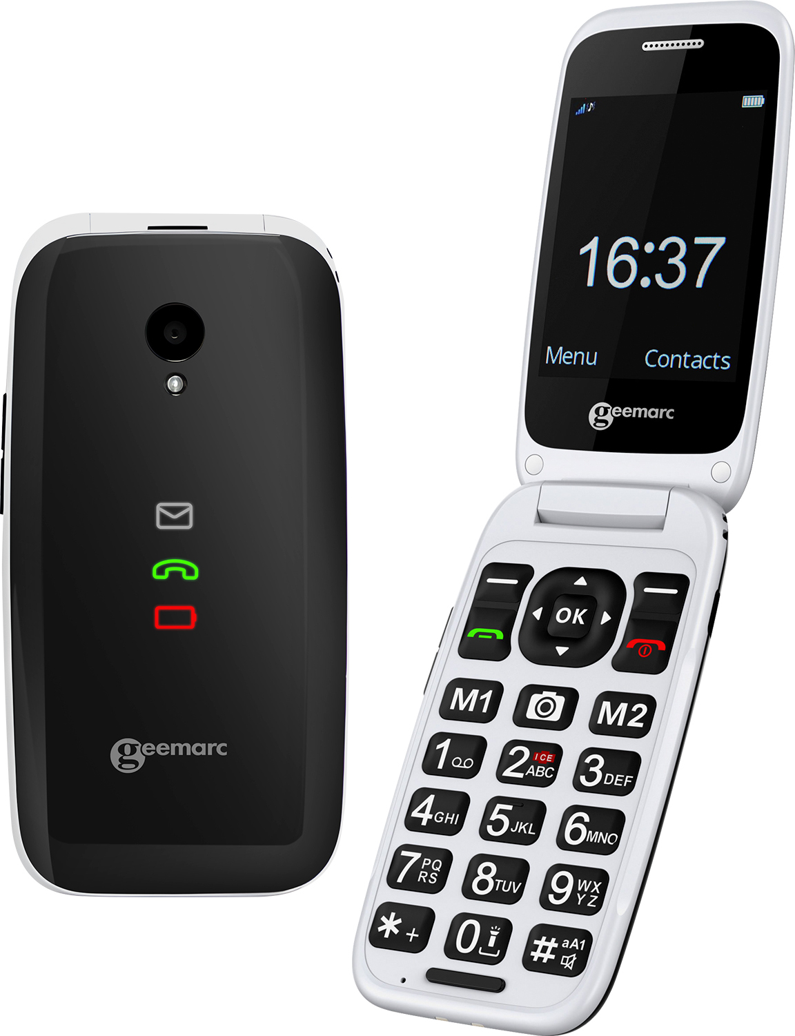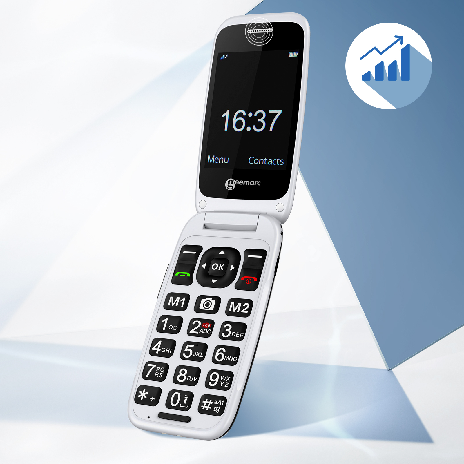 Teléfono bivalvo Geemarc senior. Compatible con audífonos M4/T4. Interfaz y funcionamiento simplificados diseñados para personas mayores. Función de llamada de emergencia con botón SOS para ponerse en contacto con hasta cinco números programados, incluida la geolocalización automática. Teclas grandes con retroiluminación. Respuesta de voz en 16 idiomas. Pantalla LCD brillante para una visualización clara. Diseño ergonómico.Características y Puntos fuertes: Teléfono móvil clamshell, diseñado específicamente para personas mayoresCompatibilidad con audífonos M4/T4: ideal para usuarios con deficiencias auditivas.Alto volumen de recepción de hasta 40 dB, ajustable mediante los botones lateralesTeclas grandes, retroiluminadas, fáciles de ver y utilizar, con alto contraste