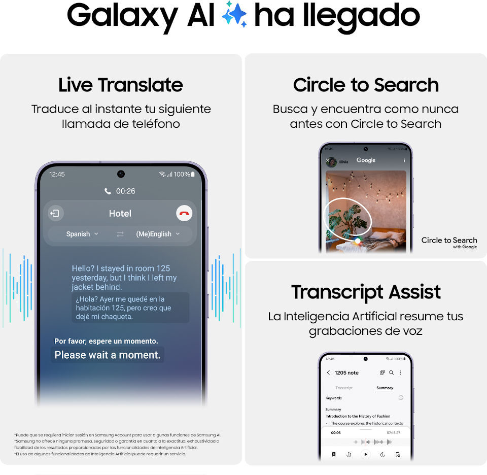 ¿Imaginas un dispositivo capaz de razonar, planificar y crear? Galaxy S24 Series no es un nuevo Smartphone más, es el primer AI Phone de Samsung. Galaxy AI ha llegado para cambiar la forma en como usamos nuestro teléfono. Navega y busca información sin esfuerzo, comunícate sin barreras de idioma o trabaja de forma más productiva e inteligente.