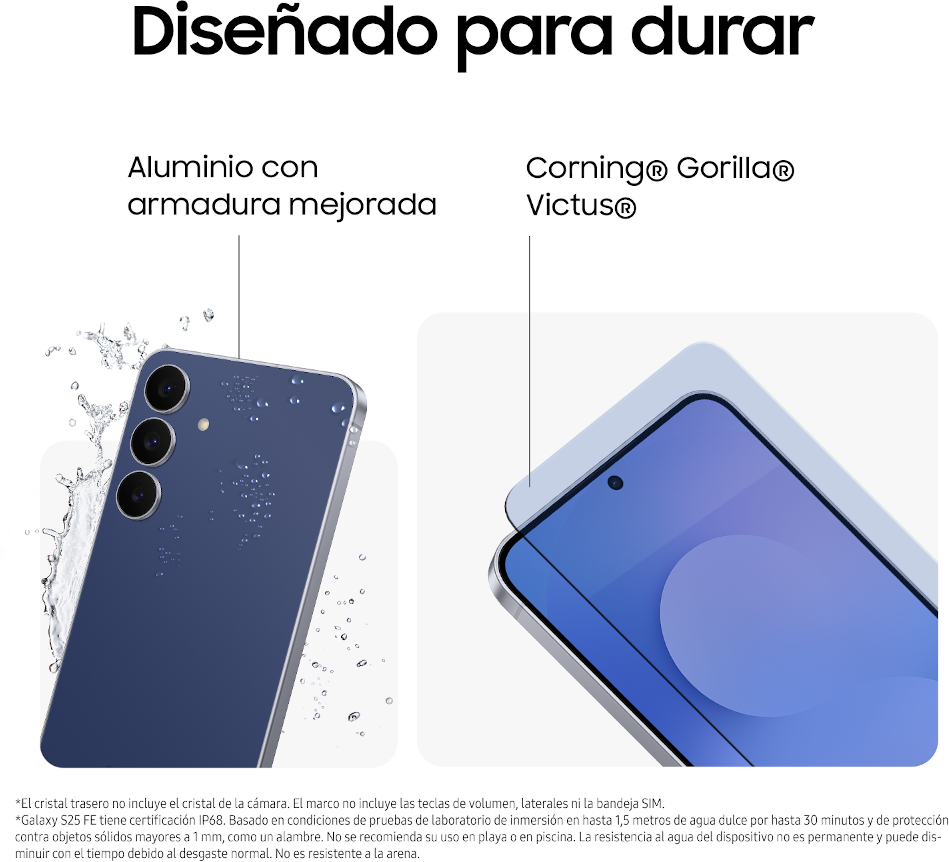 Galaxy S25 FE combina estilo, funcionalidad y resistencia. Hereda el diseño icónico de Galaxy S25 Series, con marcos metálicos, un acabado mate trasero y una cámara flotante que marca personalidad. Además, gracias a su cuerpo más fino y ligero, se adapta como nunca a tu mano… y a tu día a día.
