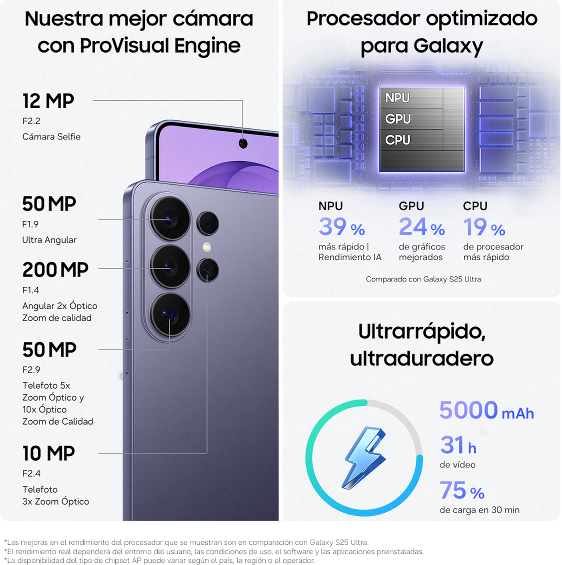 Toda esta potencia se apoya en una batería de 5.000 mAh, pensada para un uso intensivo de funciones AI durante todo el día. La carga súper rápida de 60W permite recuperar hasta el 75% en solo 30 minutos, y la carga inalámbrica añade comodidad y flexibilidad para tu día a día. Con opciones de hasta 16 GB de RAM y 1 TB de almacenamiento, Galaxy S26 Ultra está preparado para acompañarte sin límites.