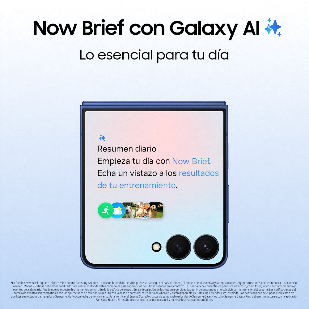 Con las nuevas opciones avanzadas de Galaxy AI, podrás disfrutar de ventajas únicas y muy sorprendentes. ¿Te gustaría poder dar órdenes o hacer peticiones a tu dispositivo directamente con la voz? Galaxy Z Flip7 cuenta con un Asistente de AI capaz de interactuar con varias aplicaciones de forma simultánea o de resolver dudas de manera inmediata, solo con tu voz y sin tener que desplegar tu dispositivo. Deja atrás las barreras del idioma con ayuda de Interpreter y consigue traducciones de conversaciones con personas de otra parte del mundo en tiempo real. ¡También podrás obtener resúmenes de textos, crear imágenes o stickers y mucho más!