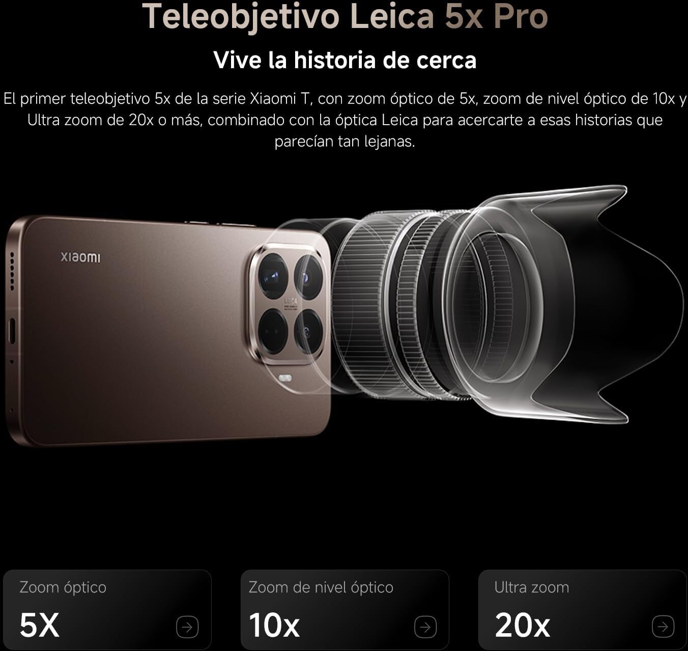El primer teleobjetivo 5x de la Xiaomi T Series, con zoom óptico de 5x, zoom de nivel óptico de 10x y Ultra zoom de 20x o más, combinado con la óptica Leica para acercarte a esas historias que parecían tan lejanas.