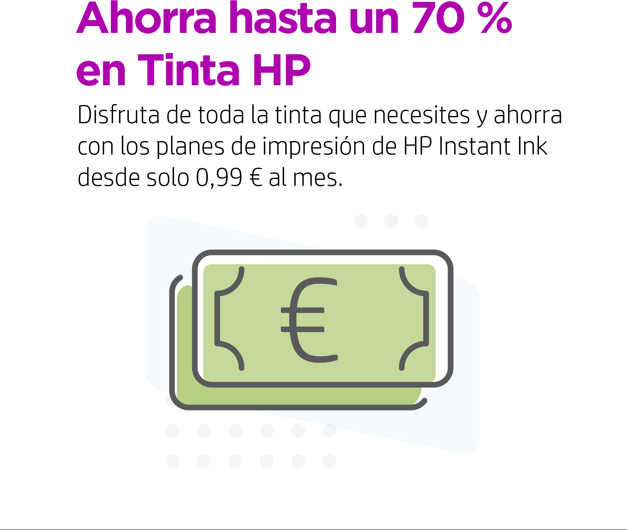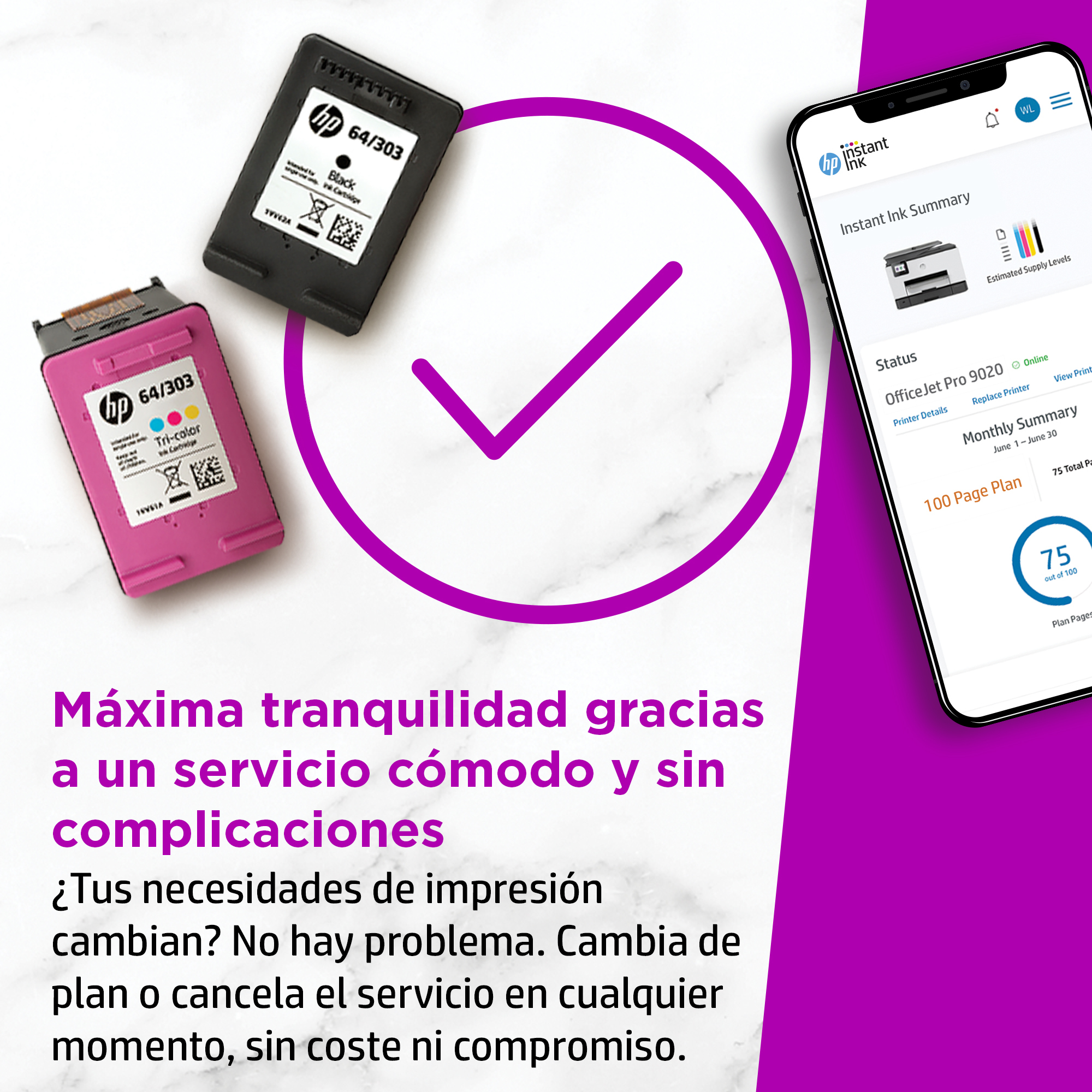 Sin complicaciones\nTodo lo que necesitas con funciones fáciles de usar. Impresión, escaneado y copia por medio de una sencilla configuración con la aplicación HP Smart,[1] además de una conectividad inalámbrica sin complicaciones.[2] Elige HP+ y obtén 6 meses de Instant Ink incluidos[3] y 1 año de garantía adicional con el uso exclusivo de la Tinta Original HP.[4] Para obtener los 6 meses de Instant Ink incluidos, el registro en Instant Ink debe hacerse en los 7 días posteriores a la configuración de la impresora. Una vez transcurridos los 6 meses, se aplicará una cuota mensual a menos que se cancele el servicio.