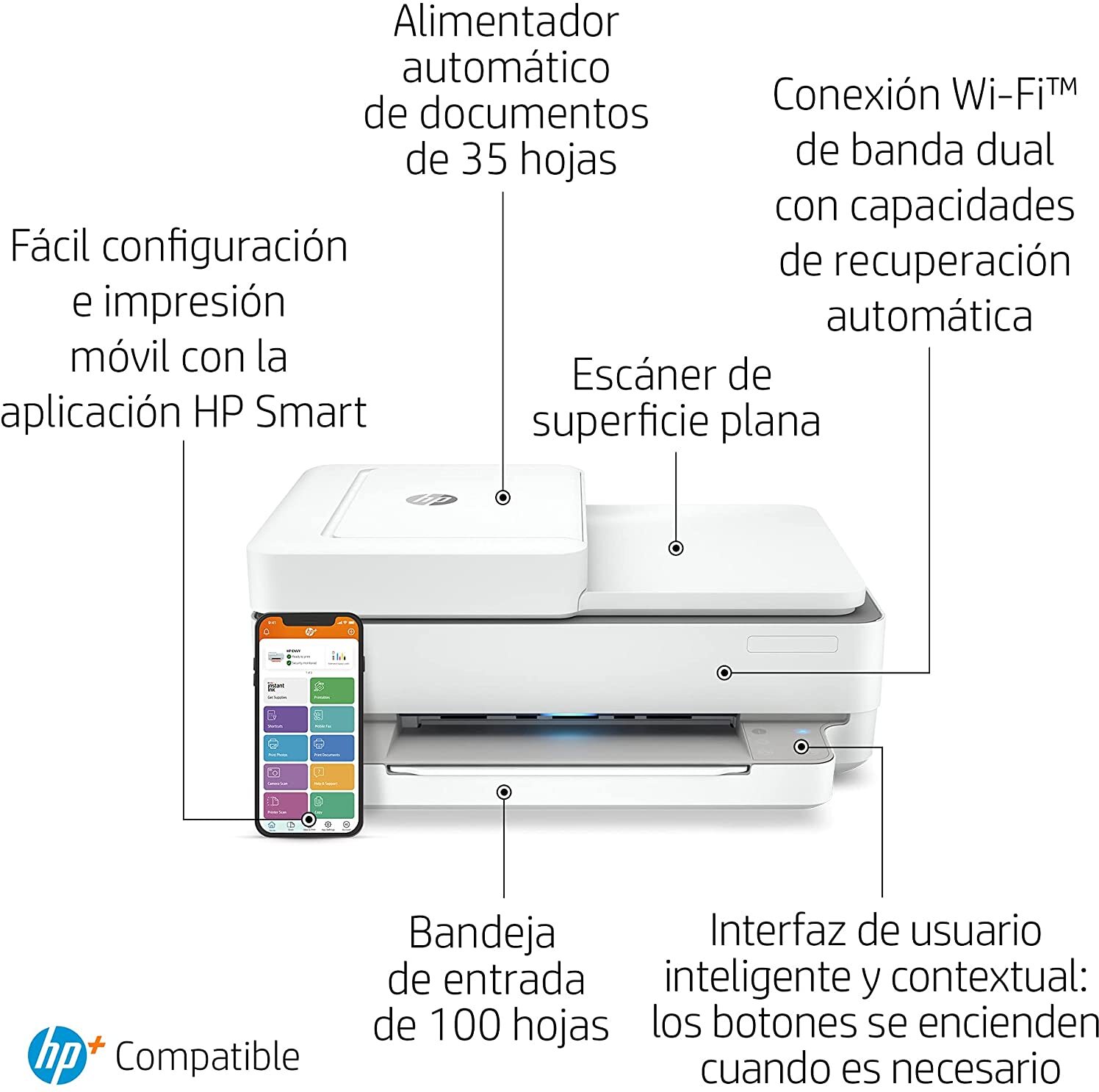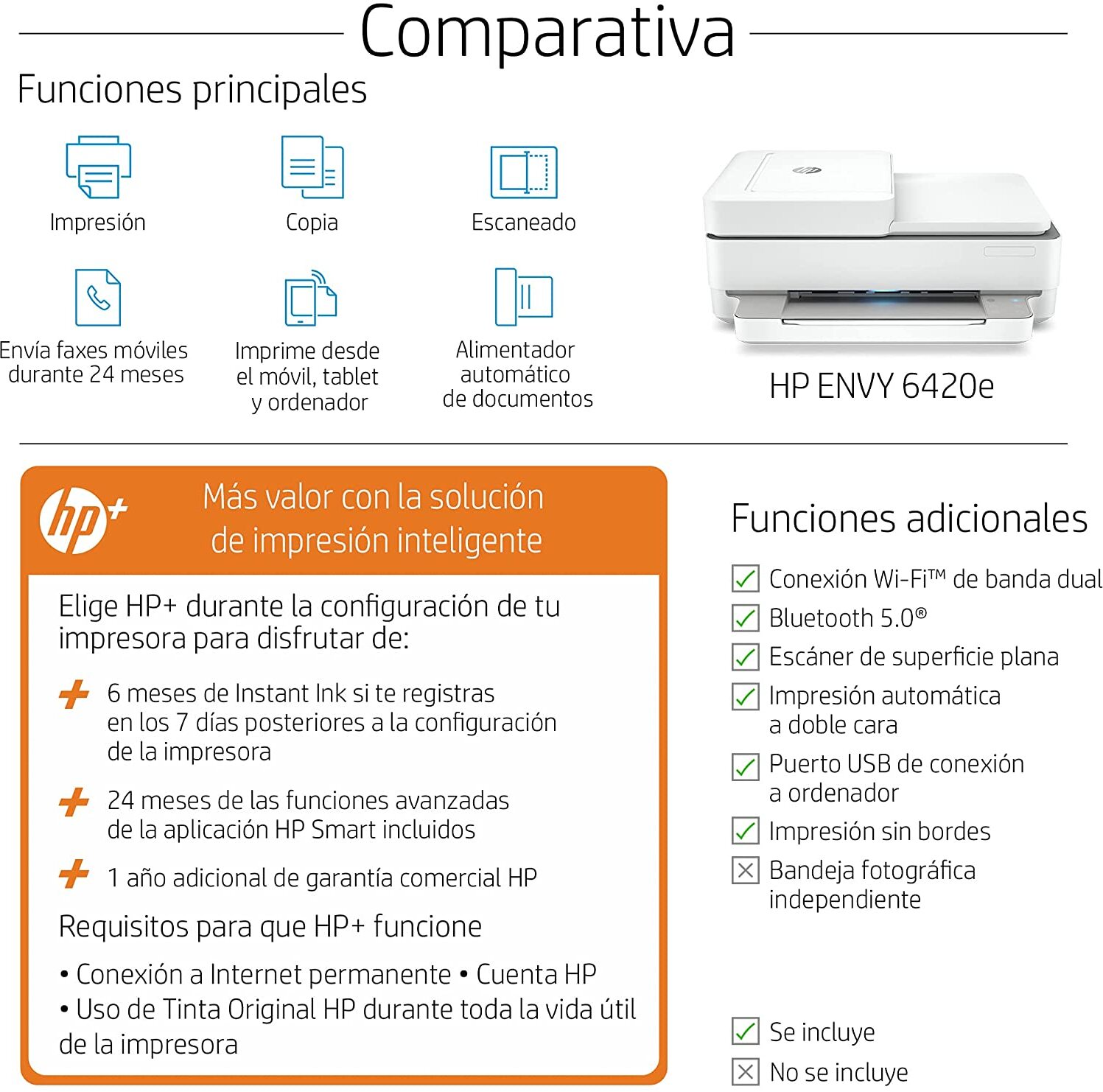 LA MEJOR IMPRESORA FAMILIAR; Imprime, escanea, copia y envía por fax móvil en blanco & negro y en color; la velocidad de impresión es de 10 ppm en negro y 7 ppm en color Alimentador automático de documentos de 35 hojas, Impresión a doble cara de forma automática, Wi-Fi de doble banda con restablecimiento automático, Wi-Fi Direct, HP Smart App, USB 2.0 de alta velocidad y Apple AirPrint DESCUBRE HP+, la solución de impresión más inteligente; CÓMODA: la impresora solicita tinta automáticamente antes de que se agote; SENCILLA: permite imprimir, escanear y gestionar todo fácilmente, incluso desde el móvil, gracias a la app HP Smart; SOSTENIBLE: utiliza cartuchos ecodiseñados, +80 % de los cartuchos de Tinta Original HP contienen plástico reciclado ELIGE HP+ en la configuración y OBTÉN 1 AÑO ADICIONAL DE GARANTÍA y 6 MESES DE INSTANT INK INCLUIDOS, si te registras a Instant Ink en los 7 días posteriores a la configuración de la impresora; Instant Ink es un servicio de impresión con el que recibes los cartuchos en casa, antes de quedarte sin tinta, con reciclaje incluido y sin preocuparte de nada. Incluye la tinta, el envío y el reciclaje desde solo 0,99 €/mes ELIGE HP+ en la configuración para activar los beneficios; HP+ requiere una cuenta de HP, una conexión permanente a Internet y el uso exclusivo de Tinta Original HP durante toda la vida útil de la impresora; Más información legal en la página de HP en la sección de HP+ Esta impresora es compatible con los cartuchos de inyección de tinta originales HP 305 Negro, HP 305 Tricolor, HP 305XL Negro de alta capacidad y HP 305XL Tricolor de alta capacidad ? .Especificaciones: .- Color White.- Marca HP.- Estilo ?Bluetooth.- Dúplex Automático.- Tamaño ?36.11 x 43.25 x 17.4 cm.- Fabricante ?hp.- Incluye baterías ?No.- Nombre del modelo HP Envy 6420e HP+.- Peso del producto ?6.16 kg.- Necesita baterías ?No.- Interfaz de hardware USB.- Número de productos ?1.- Salida de la impresora Color.- Dimensiones del producto ?36.11 x 43.25 x 17.4 cm; 6.16 kilogramos.- Tecnología de impresión Inyección de tinta.- Tecnología de conectividad Bluetooth.- Número de modelo del producto ?223R4B.- Impresión de soportes físicos Papel foto brillante.- Capacidad de almacenamiento de memoria 256 MB.- Identificador de producto del fabricante ?223R4B
